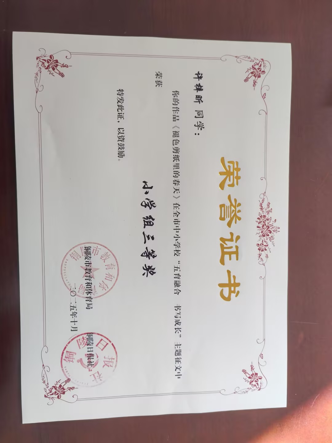 在全市中小学校“五育融合 书写成长”主题征文活动中,601班许梓昕的作品《褪色剪纸里的春天》获得小学组三等奖,杨洁老师被评为“优秀指导教师”。