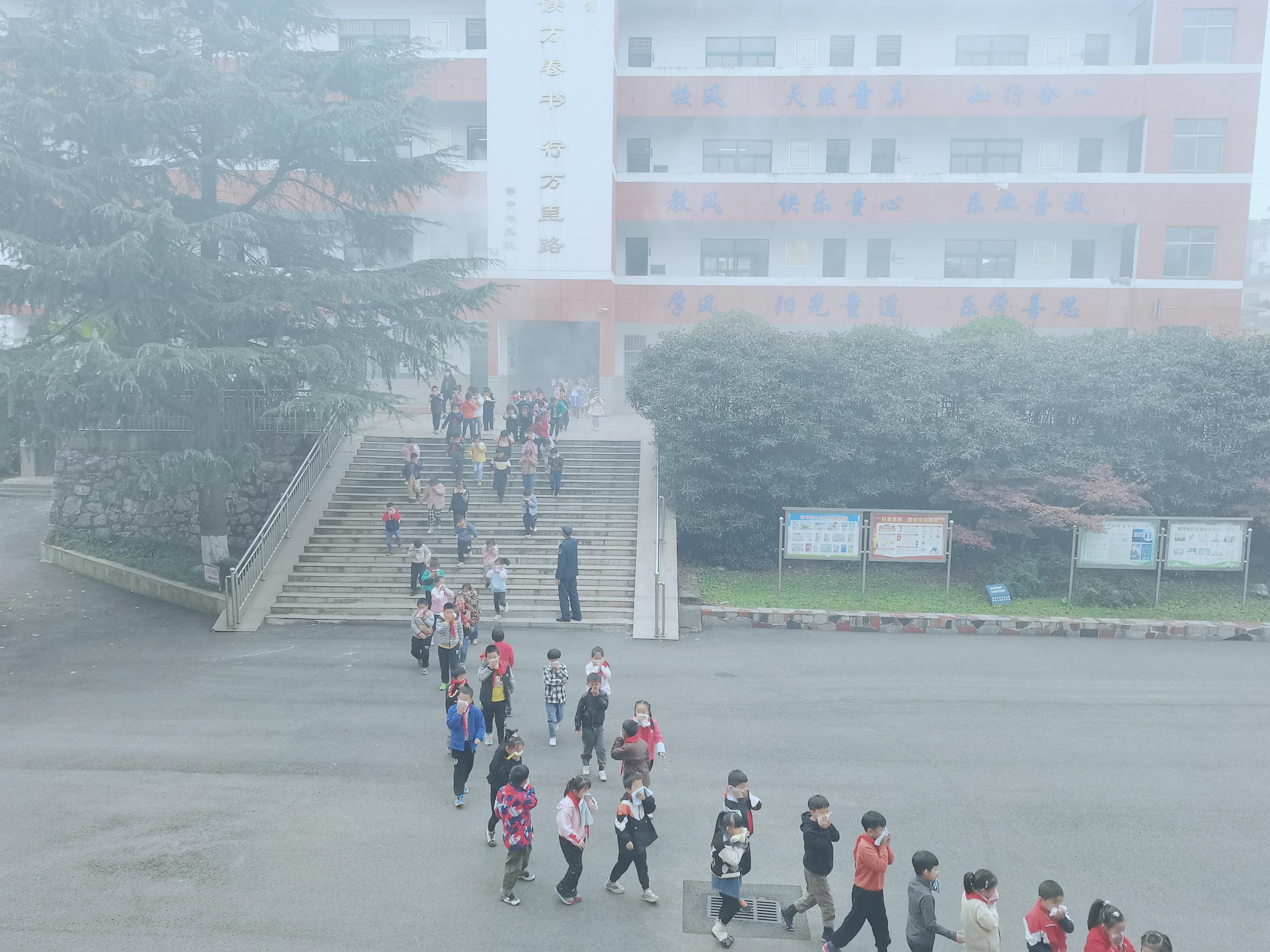 上午9时整,校长胡朋贵宣布消防疏散演练正式开始,随着警报声的响起,全校14个班级的学生在教师的组织下迅速有序地从教室跑出,每人用湿毛巾捂住口鼻,弯腰,有序逃出教学楼,到达指定地点集中。