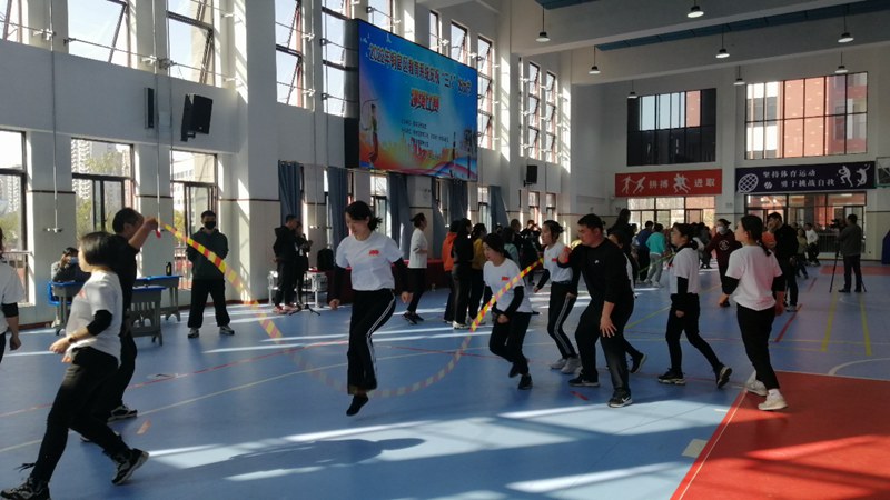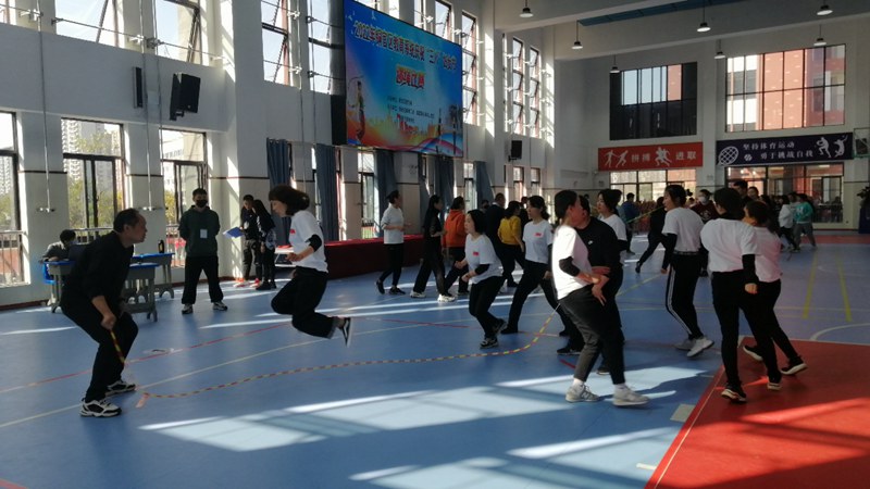 本次比赛为十人八字跳绳,女教职工们个个精神饱满,严阵以待。哨声一响,每个老师都奋力拼搏着,灵活的跳绳在脚下舞动,紧张而不失热烈的竞赛开始了。赛场上,加油声、呐喊声、欢笑声此起彼伏,整个体育场里充满着一片快乐、健康、向上的气氛。