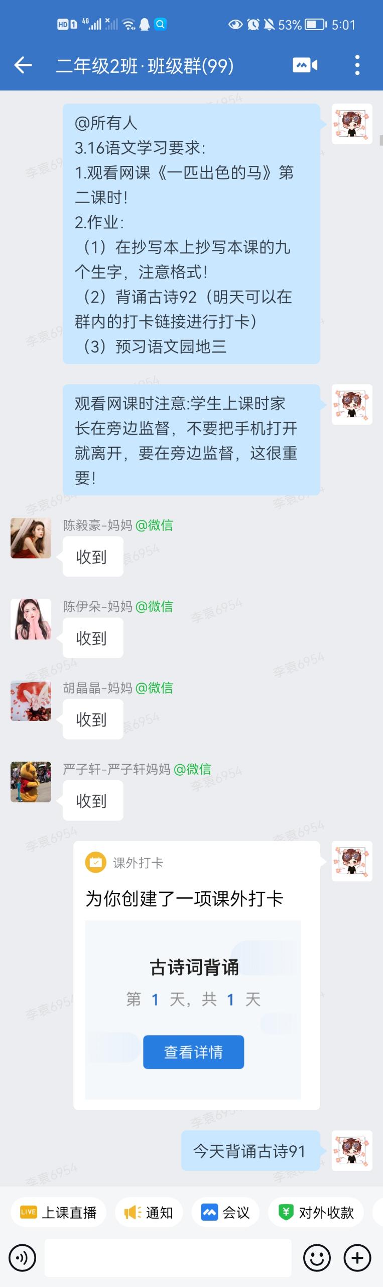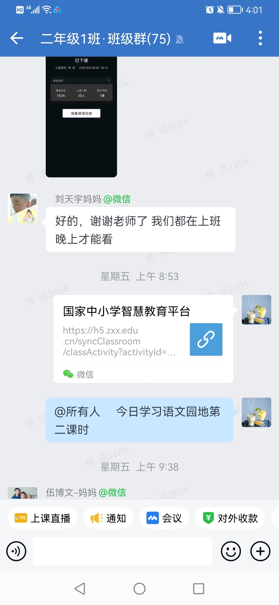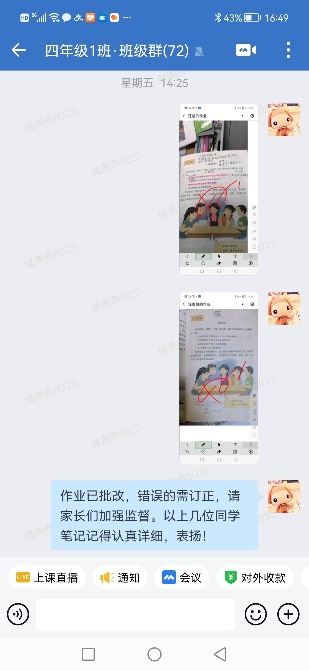 德彩网教师利用网络实现空中课堂,各学科教师根据线下课程安排、线下教学进度、班级实际及资源情况,自主选择资源平台,推送给学生进行线上学习。线上学习资源平台有:⑴国家中小学智慧教育平台 www.zxx.edu.cn⑵皖教云 www.ahedu.cn⑶铜陵市智慧教育平台 http://yun.tledu.cn/;然后教师在班级企业微信群直播平台给学生答疑解惑,根据“双减”政策给学生布置适量作业并上传,最后教师再将学生练习情况予以批改,总结归纳,反馈给学生。