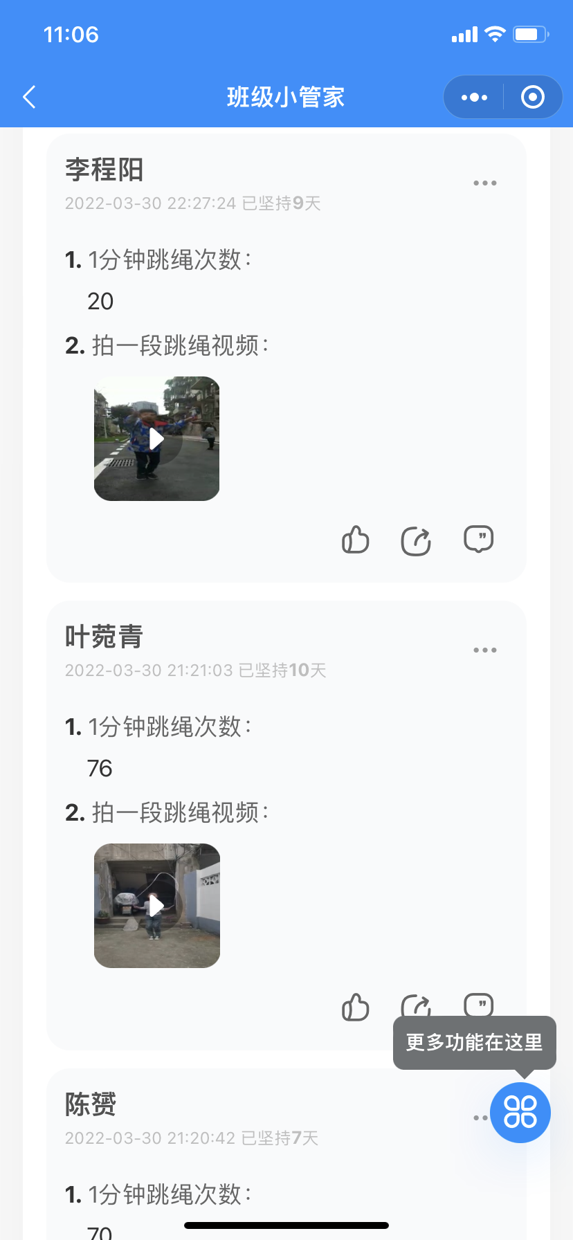 在做好学习的同时,我班学生积极锻炼身体,线上跳绳打卡。