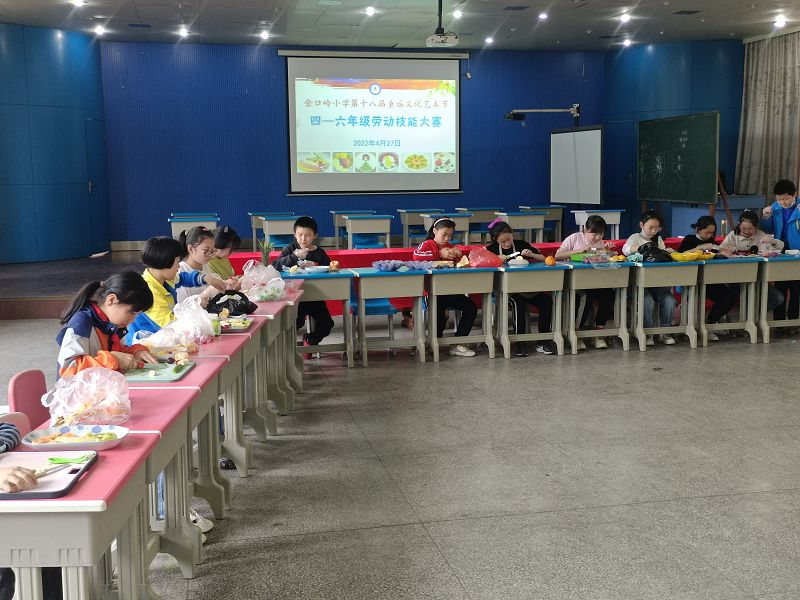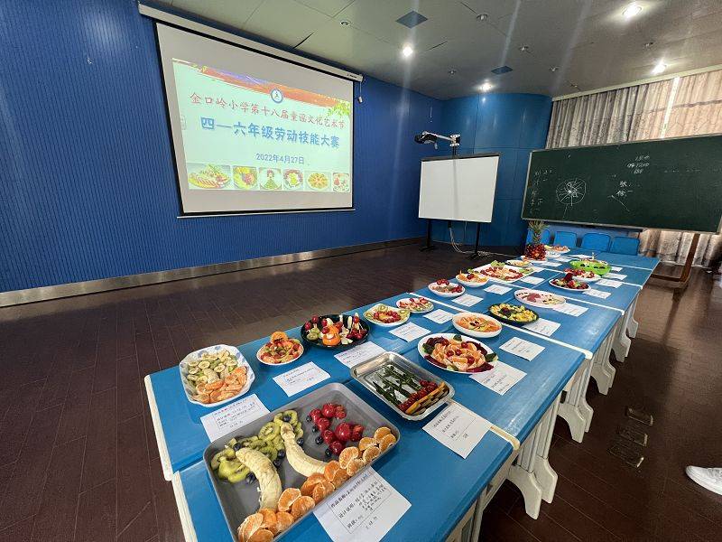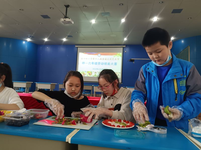 4月27日下午的报告厅,果香四溢,热闹非凡,德彩网第十八届童谣文化艺术节四-六年级劳动技能大赛火热进行中。