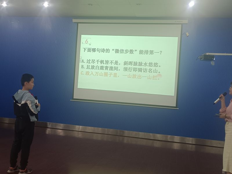 本次大赛从五、六年级每班选出4位同学,共20人参加,大赛分为三个环节,第一轮笔试中,薛常乐、刘思宇、周宇等10名同学脱颖而出,成功晋级第二轮。第二轮是个人答题赛,每位学生答6题,题目形式活泼多样,将经典与现代巧妙融合,体现了命题老师深厚的诗词功底。第三轮是“飞花令”,6位选手轮流答出含“月”的诗句。最令人叫绝的当属“飞花令”——要求选手在极短的时间内说出含有相同字的一联诗句,这对参赛选手的诗词储备、心理素质和随机应变能力有着极大的考验,选手之间如高山流水遇知音,把激烈的对决转化成了诗词的交流盛宴。别看他们年纪小小,可个个才思敏捷、妙语连珠,丰富的古诗词积累更是令人赞叹,精彩的表现不时赢得阵阵掌声。台下的观众们则屏息凝视,唯恐错过精彩瞬间。最终502班的周宇同学,蟾宫折桂!