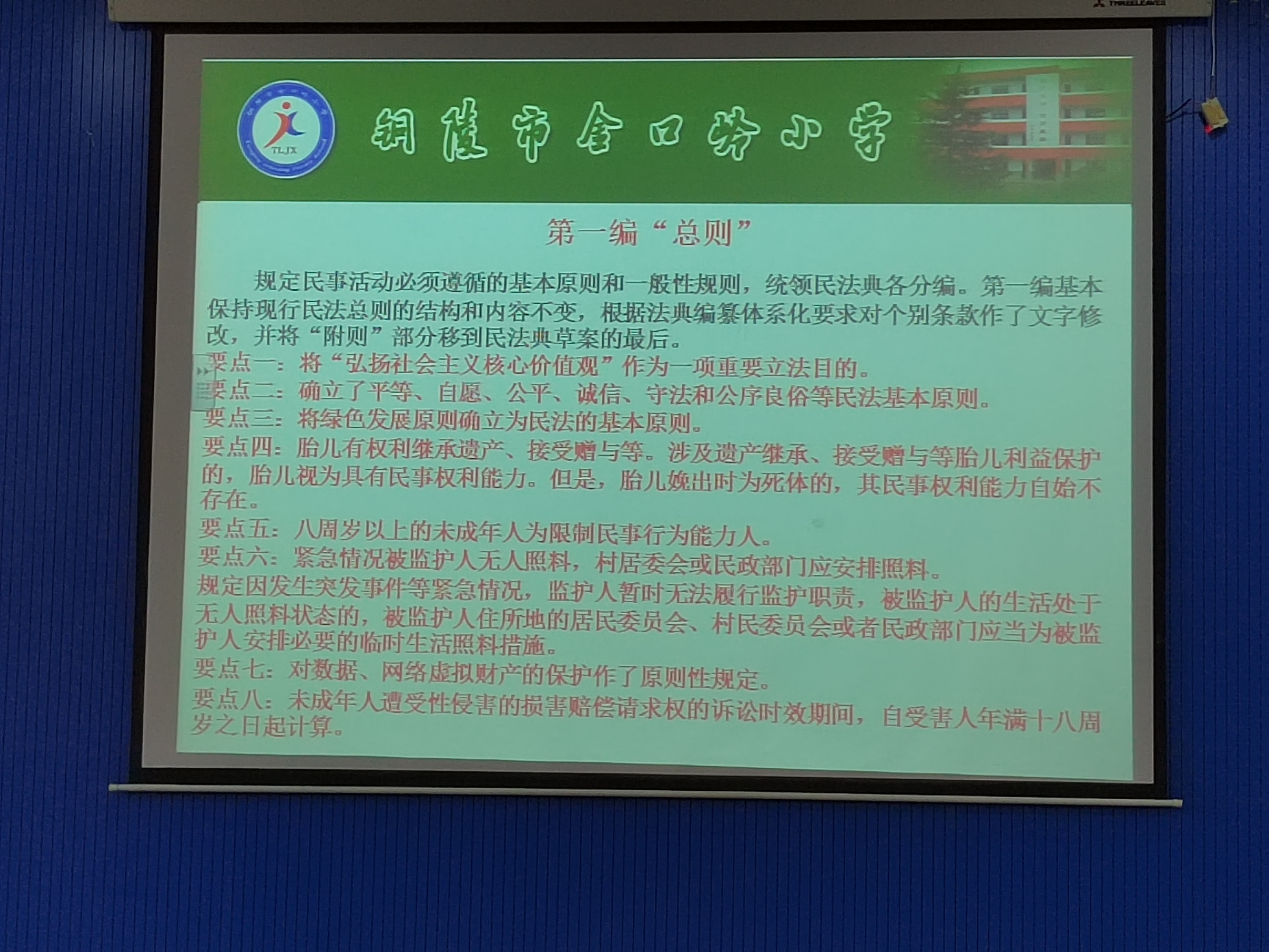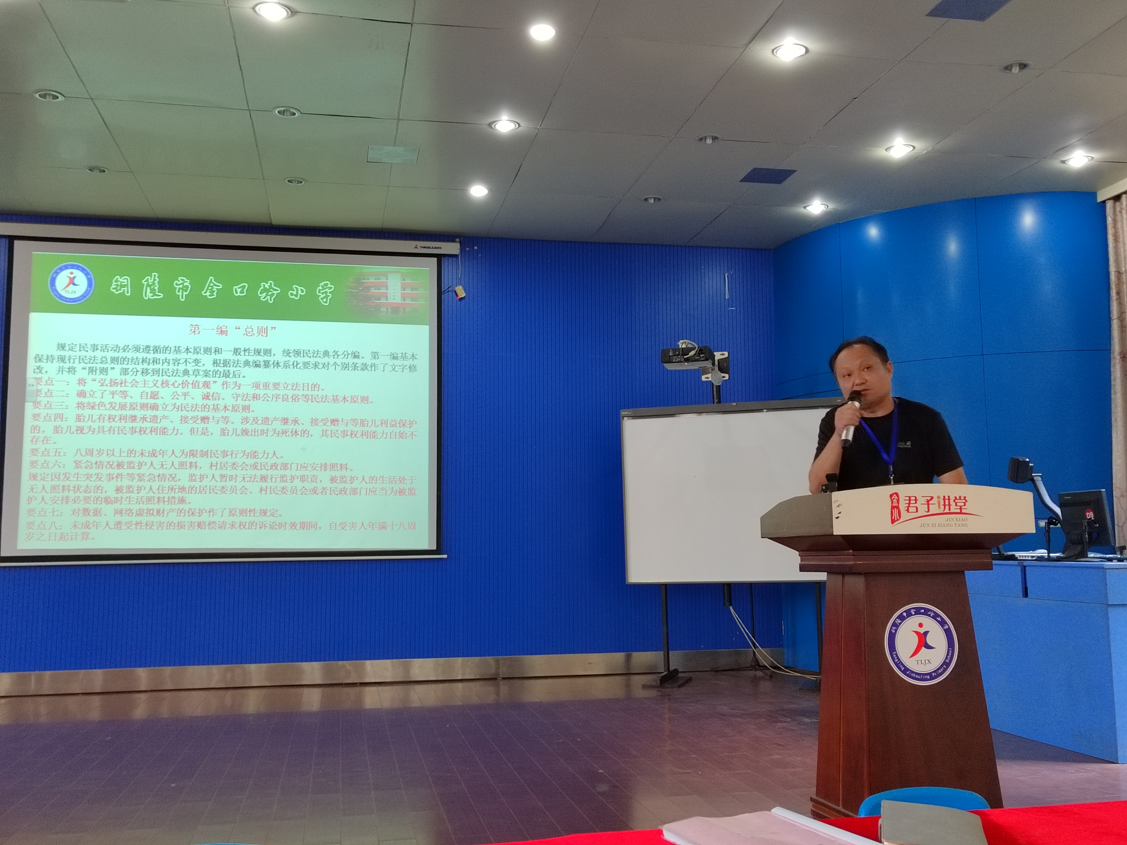 《民法典》的成功出台是推进全面依法治国、推进国家治理体系和治理能力现代化的重大举措,具有划时代意义。为进一步做好《民法典》的宣传教育工作,提高教职工的法治意识与法律素养,6月6日下午午,我校组织了《民法典》专题学习讲座。讲座由铜官区人民法院人民陪审员、学校副校长黄言斌主讲,校长胡朋贵主持,全体教职工全程聆听了讲座。