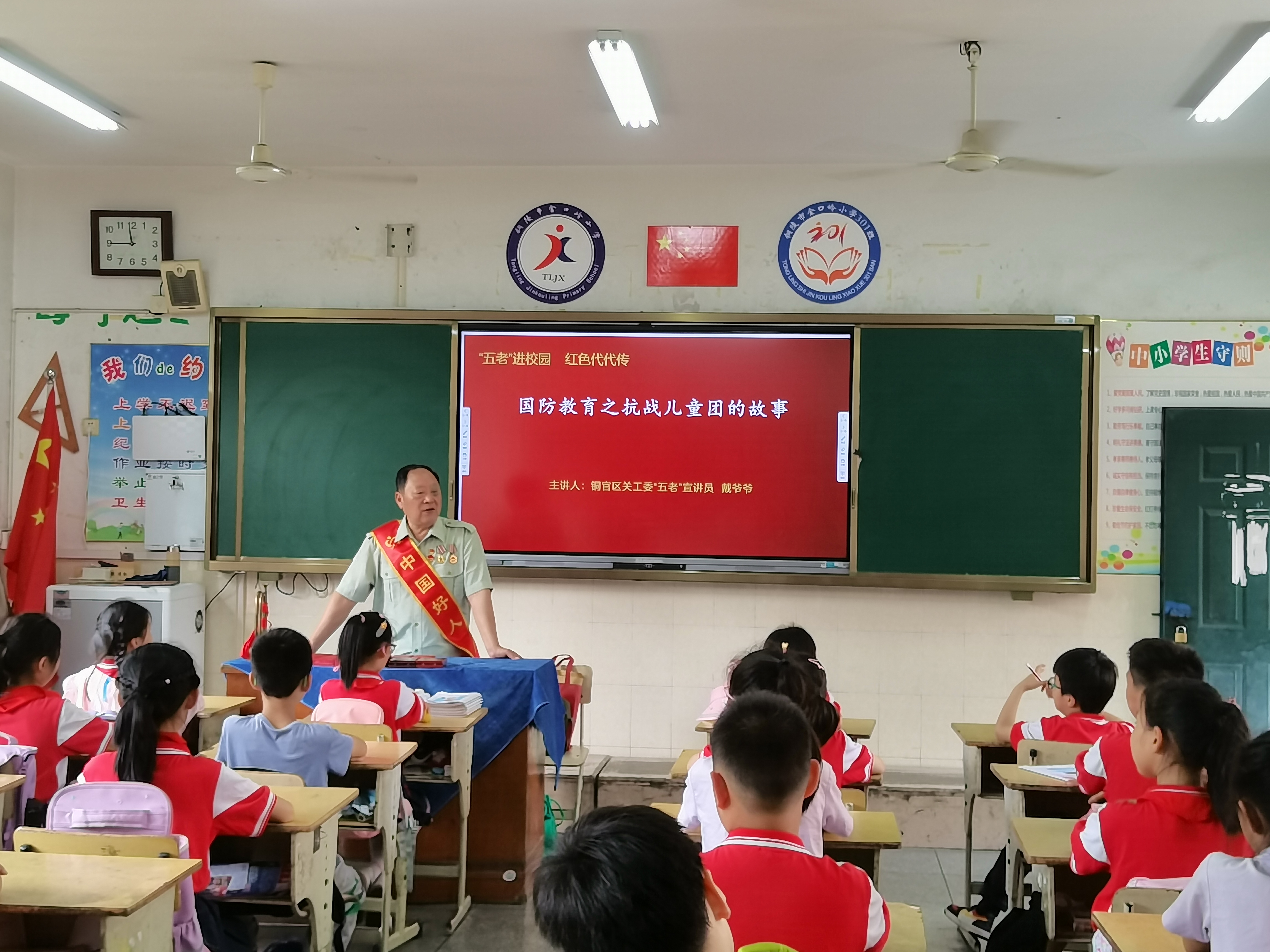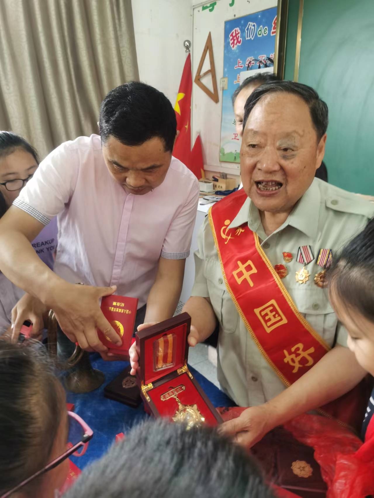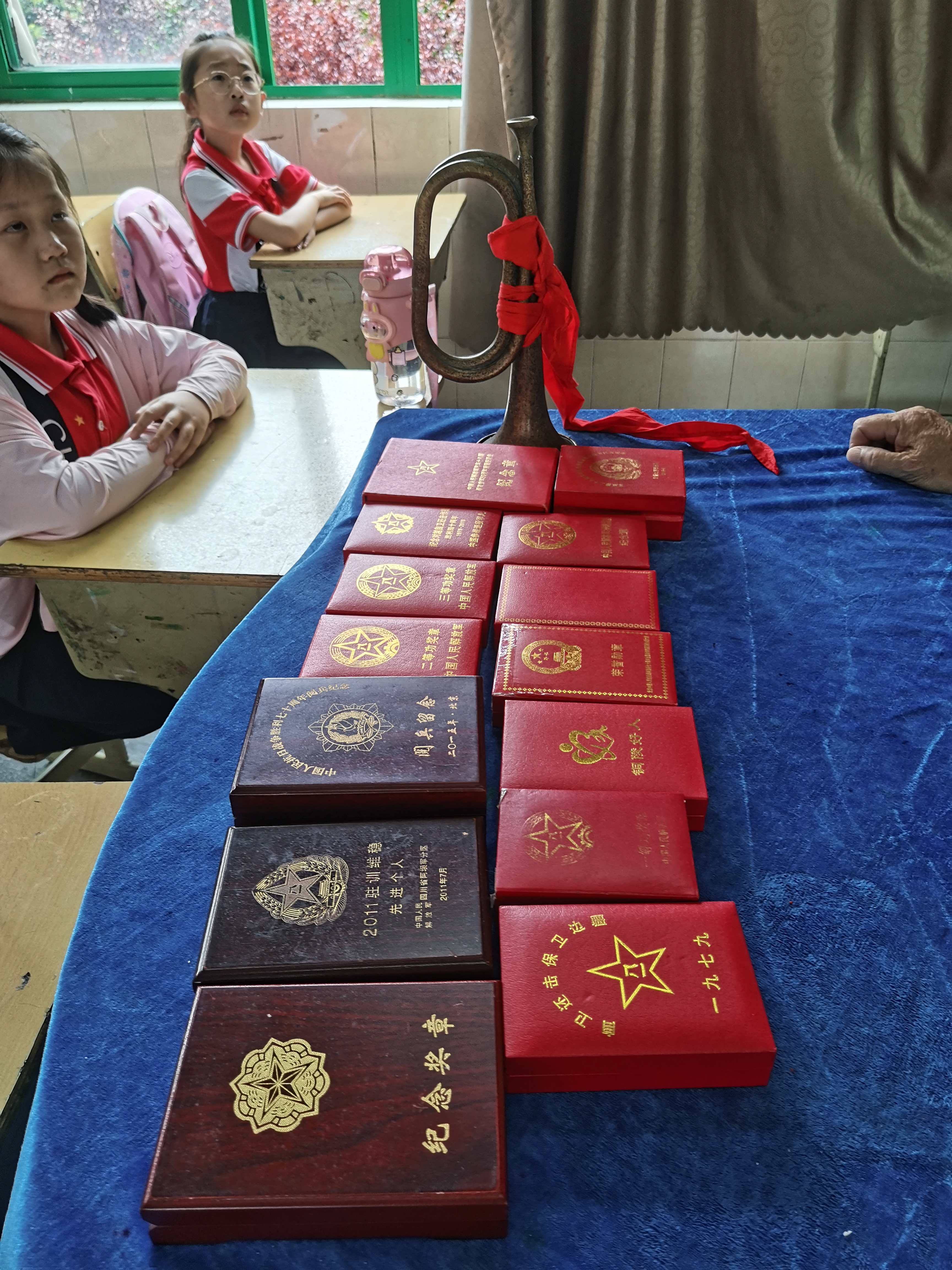 6月13日,铜陵好人、铜官区关工委“五老”报告团宣讲员戴恒勤老人带着几十枚军功章和一把军号来到了德彩网,向401班的同学们讲述了军功章背后的故事,开展了一次国防教育宣讲活动。