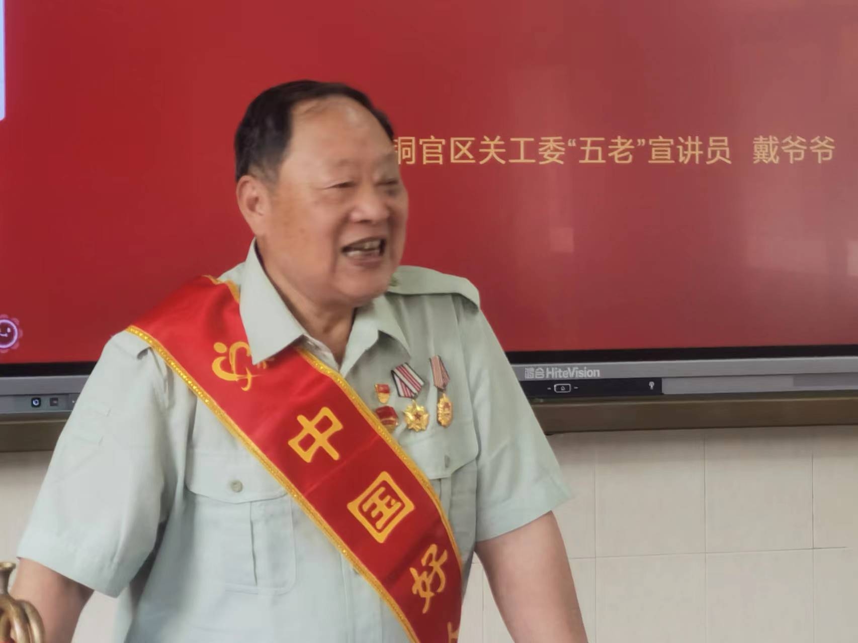宣讲中,戴爷爷结合自己部队的战斗生活,声情并茂地讲述了一枚枚军功章背后的革命故事。在老人展示的勋章中,最早的是红军井冈山时期颁发的,其中有抗日战争、解放战争时期的,也有抗美援朝和建国初剿匪时期颁发的,还有解放后颁发的重要军事纪念章……