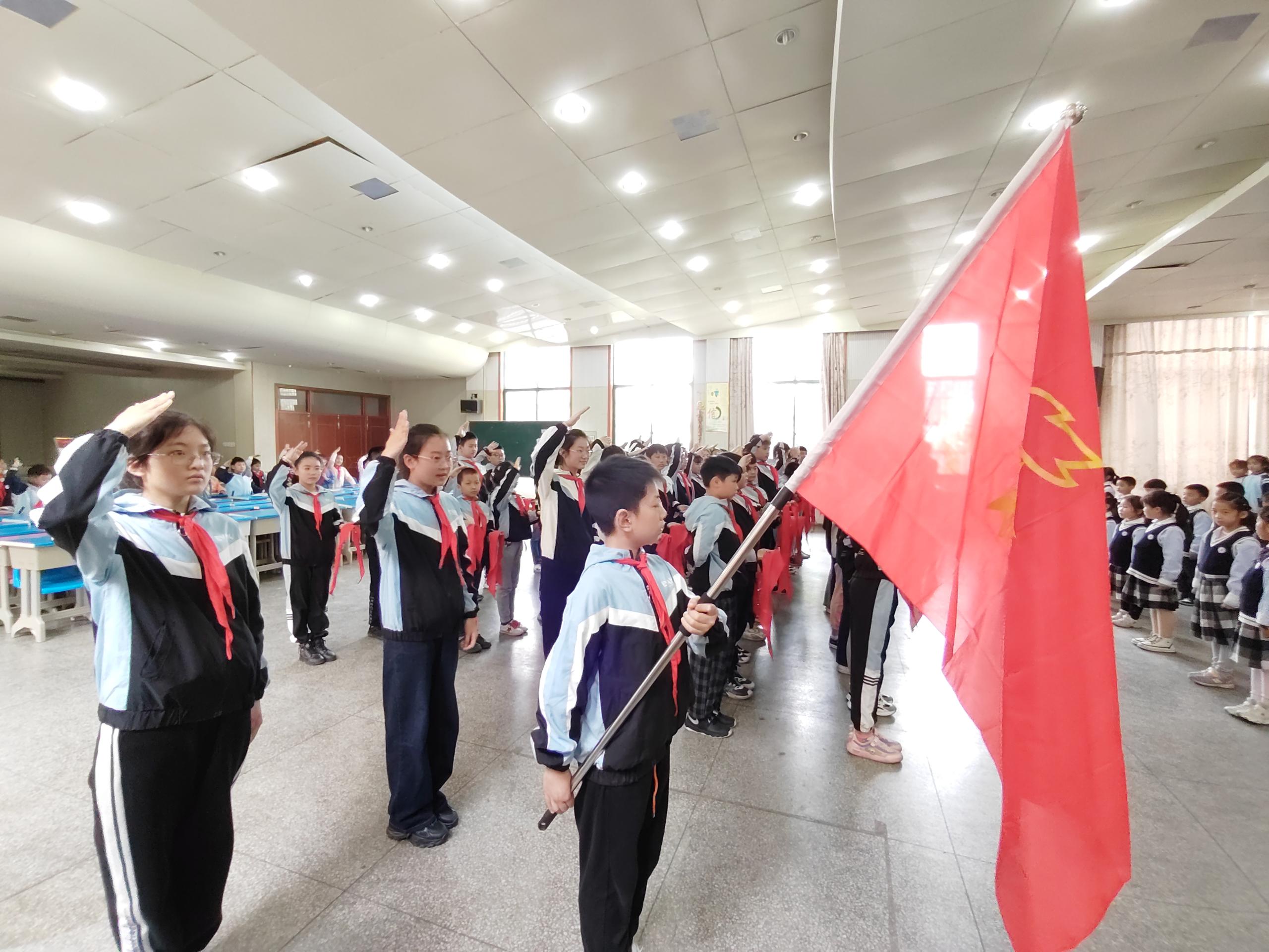 在鲜艳的队旗下,新队员们高举右手,一起庄严宣誓:“我是中国少年先锋队队员。我在队旗下宣誓:我热爱中国共产党,热爱祖国,热爱人民,好好学习,好好锻炼,准备着:为共产主义事业贡献力量!”