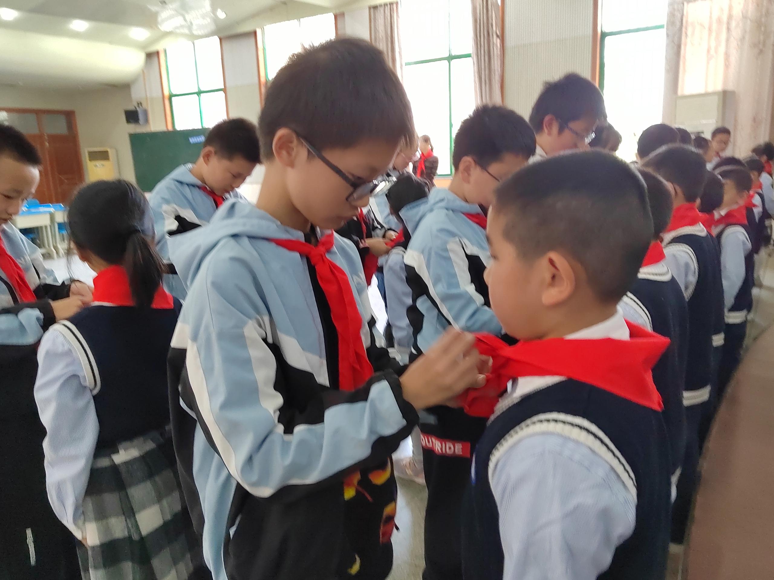 随后,六年级的老队员们手捧一条条鲜艳的红领巾为一年级新队员佩戴红领巾,新老队员互敬队礼,寓意着星星火炬,代代相传,新老队员们的情感紧紧相连。