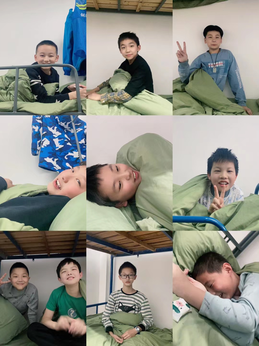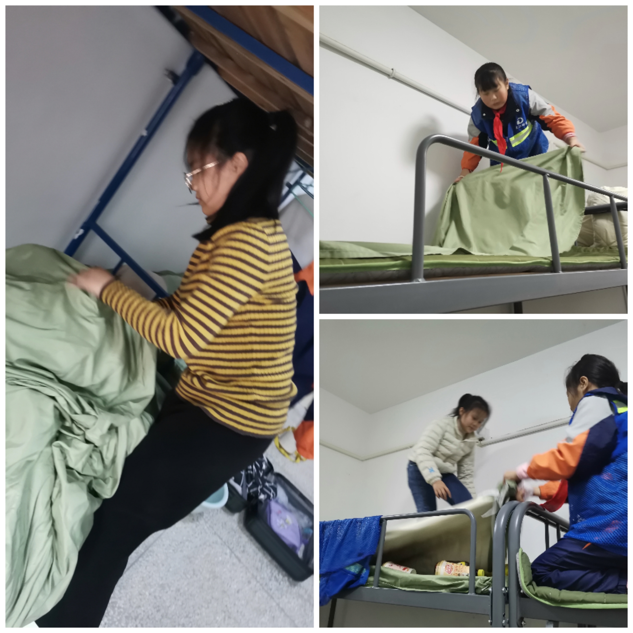 带上行囊,远离父母的唠叨,孩子们的脸上写满了快乐,可是分完宿舍,立刻就面临着第一个考验——套被褥。由于绝大多数孩子在家里都是衣来伸手、饭来张口的王子和公主,大家顿时都傻了眼。不过,正是这样,实践活动的必要性就体现出来了,大家互相帮忙,现学现卖,没过多久,困难就被克服了。