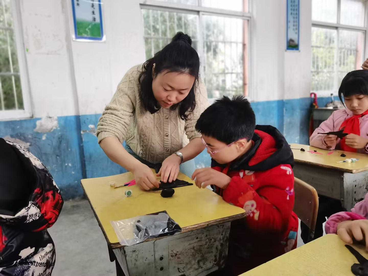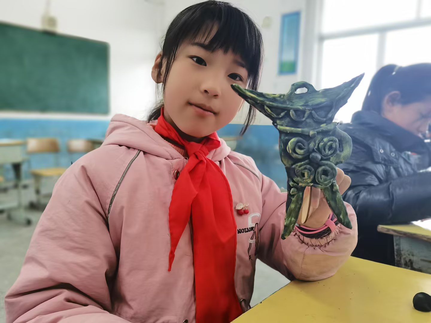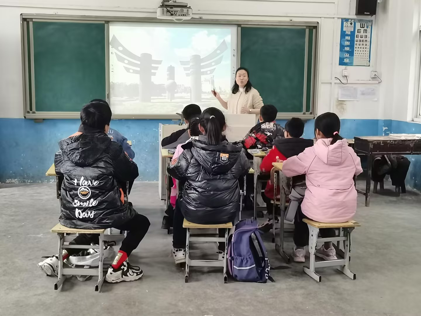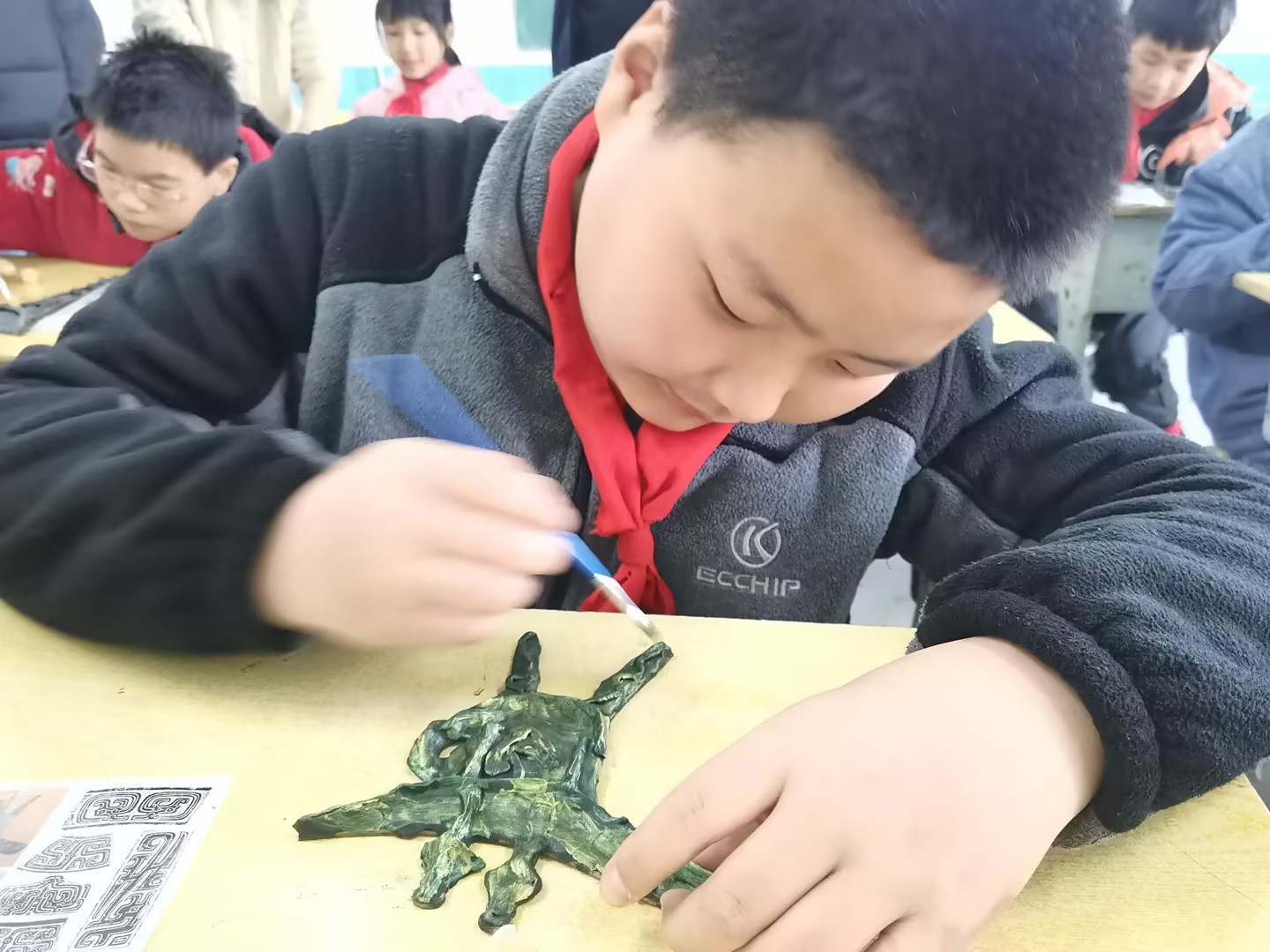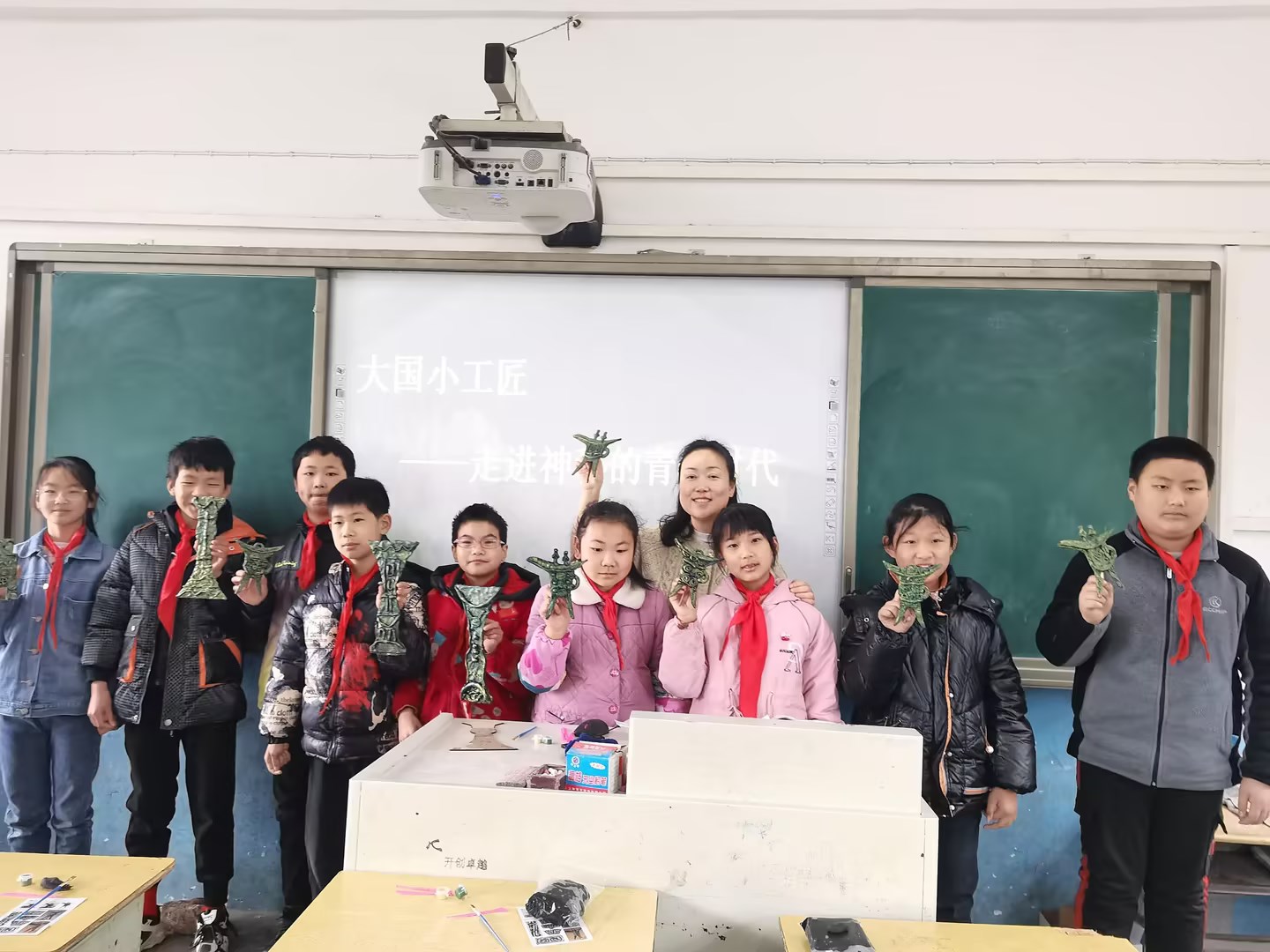 此次结对共建,教学是重头戏。我校优秀的美术教师万琦婧老师给七井小学带来了一节五年级的仿青铜雕塑制作《大国小工匠——走进神秘的青铜时代》。万老师以铜陵标志性青铜雕塑丰收门为切入点,通过对中国古代青铜艺术的欣赏以及展示中国古代青铜器的奇异造型和纹饰,引导学生了解远古先民的生活和艺术创造力,最后指导学生通过黏土、薄木板、颜料、刻刀等工具制作出一件仿青铜雕塑作品。第一次接触仿青铜雕塑的学生们虽然有些腼腆,但脸上掩饰不住激动喜悦的光芒,大家全神贯注地聆听万老师的每一句话,观看她示范的每一个动作,生怕错过一个细节。听课的老师们时而认真记录,时而伸长脖子观看学生的制作情况。蒋莹莹老师说,这节课的意义非凡,对于培养农村学校学生们的审美能力、造型能力和创造能力起着巨大的作用。