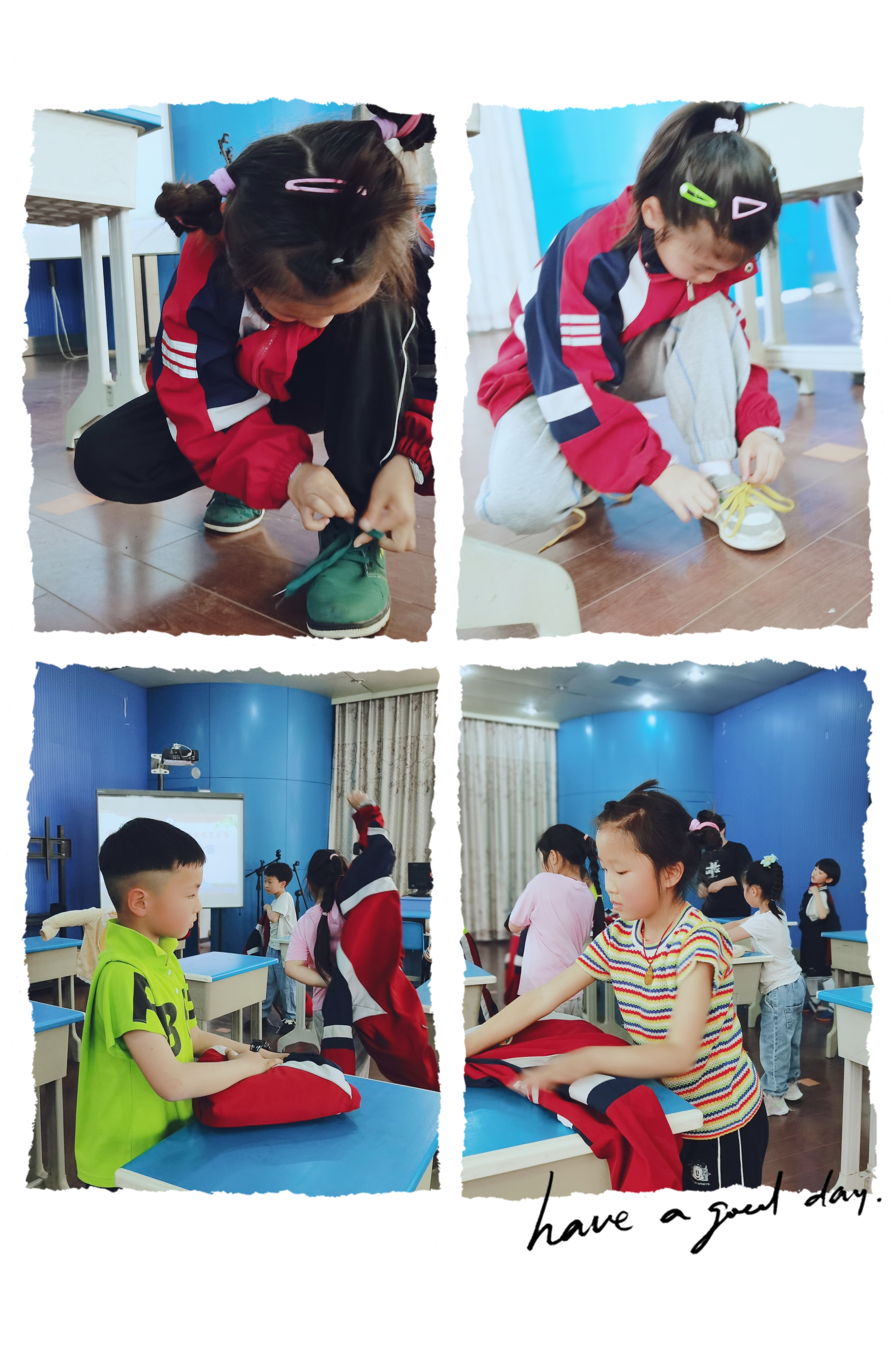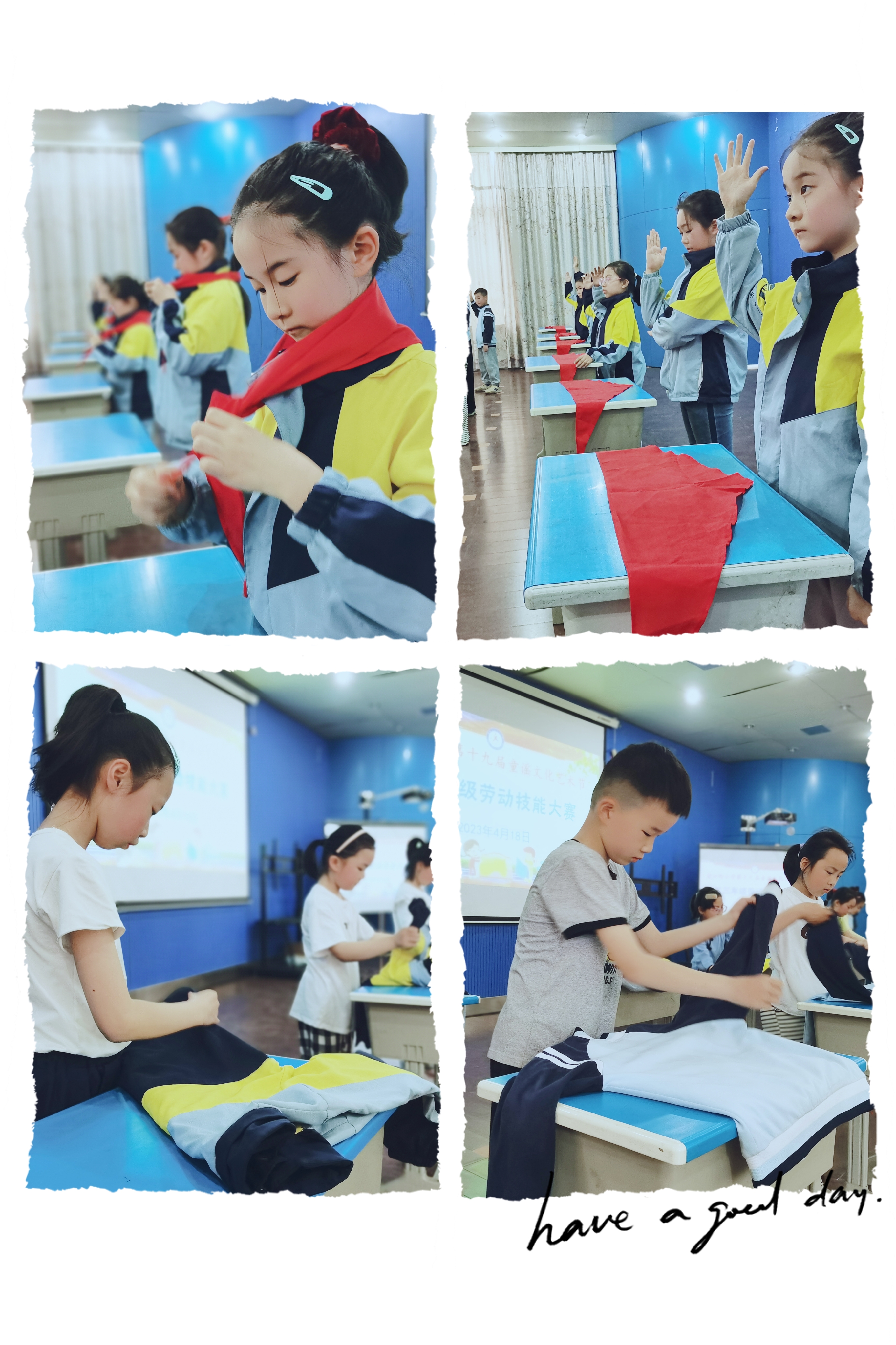 本次大赛围绕学生的日常生活技能展开,根据学生的不同年龄特点,分层次、分年级、分项目进行比拼。一年级穿叠衣服系鞋带,二三年级穿叠衣服系红领巾,四年级创意水果拼盘,一至四年级扫地拖地,五年级剥豆子,六年级钉纽扣。