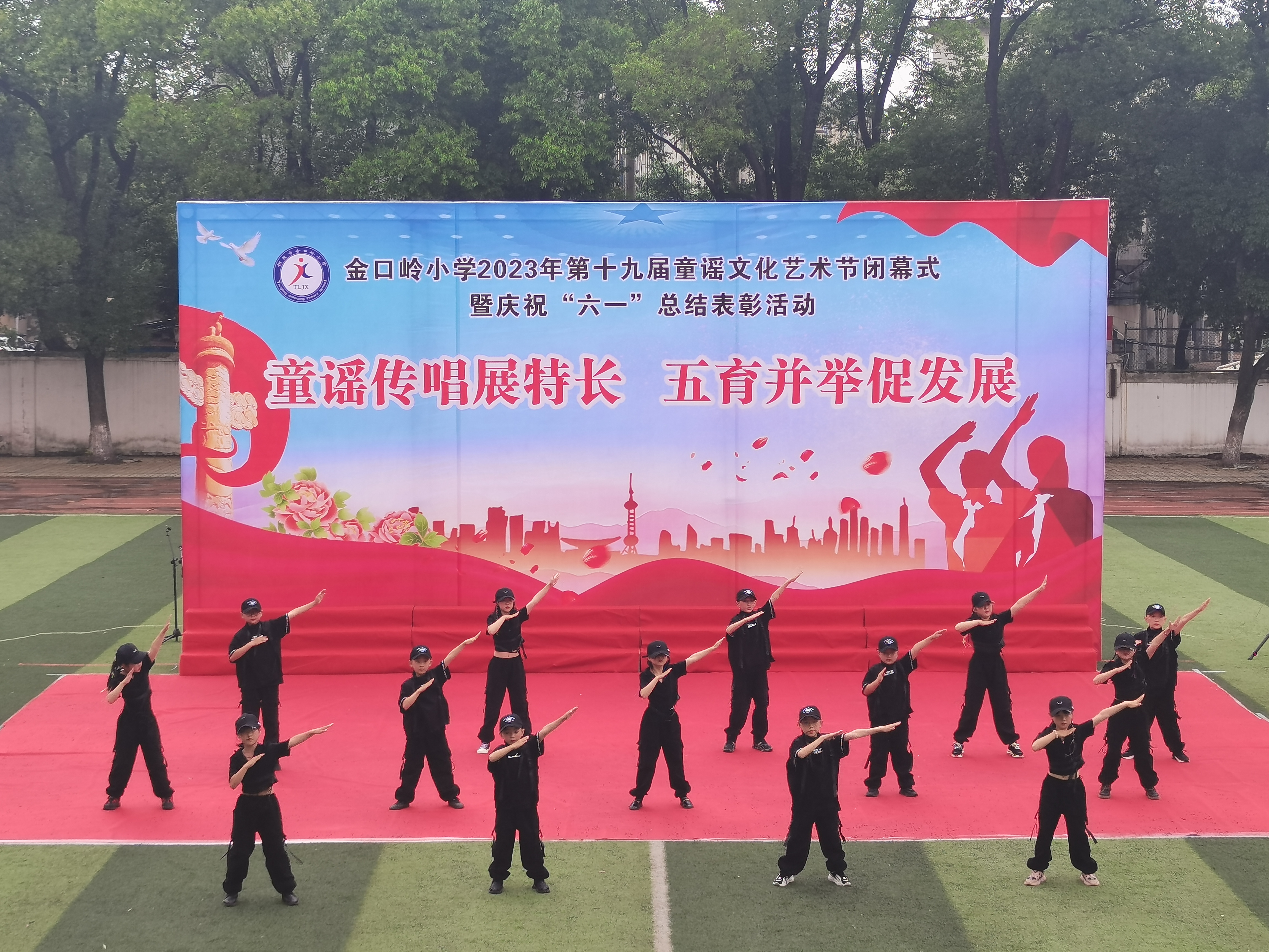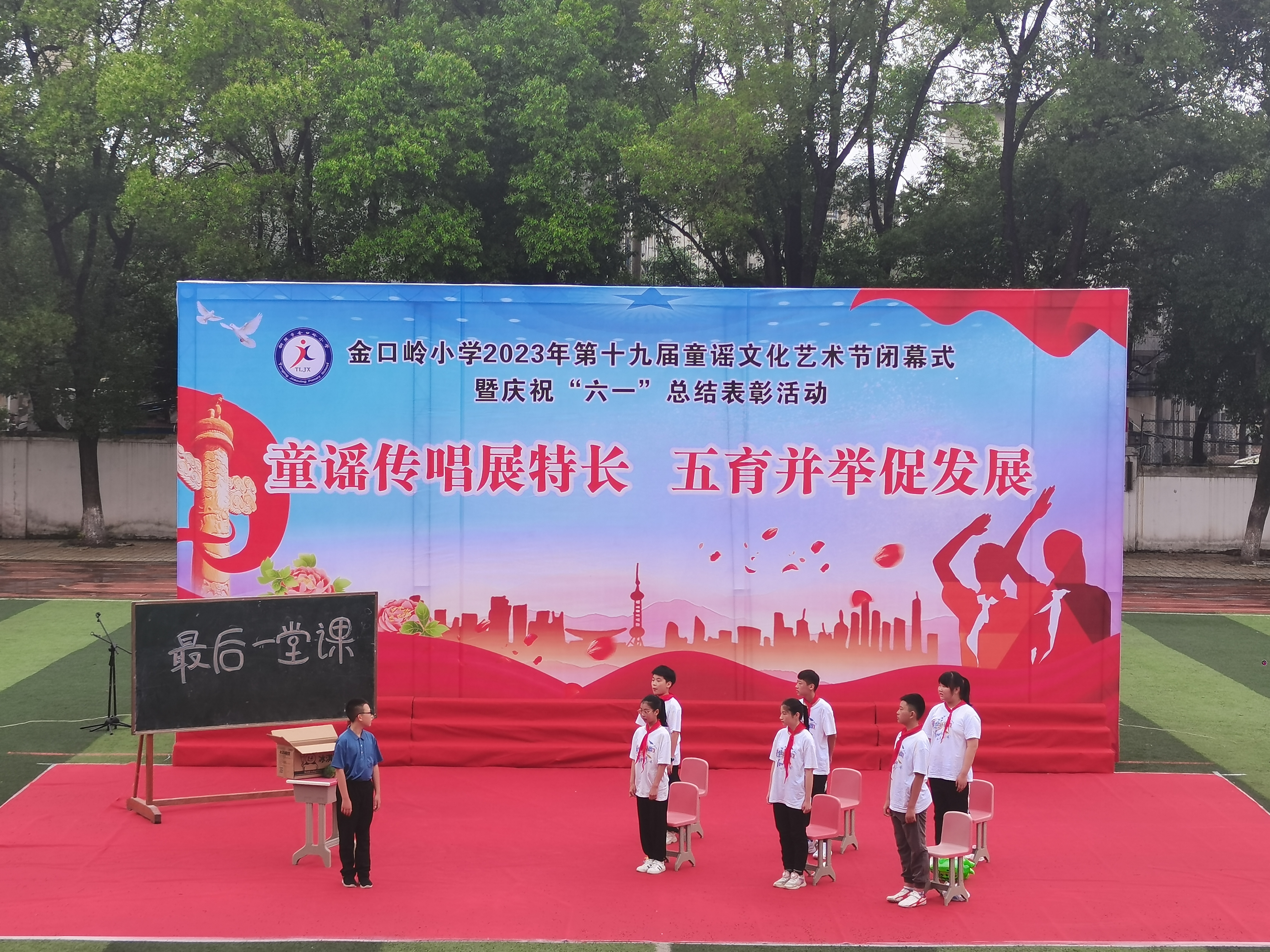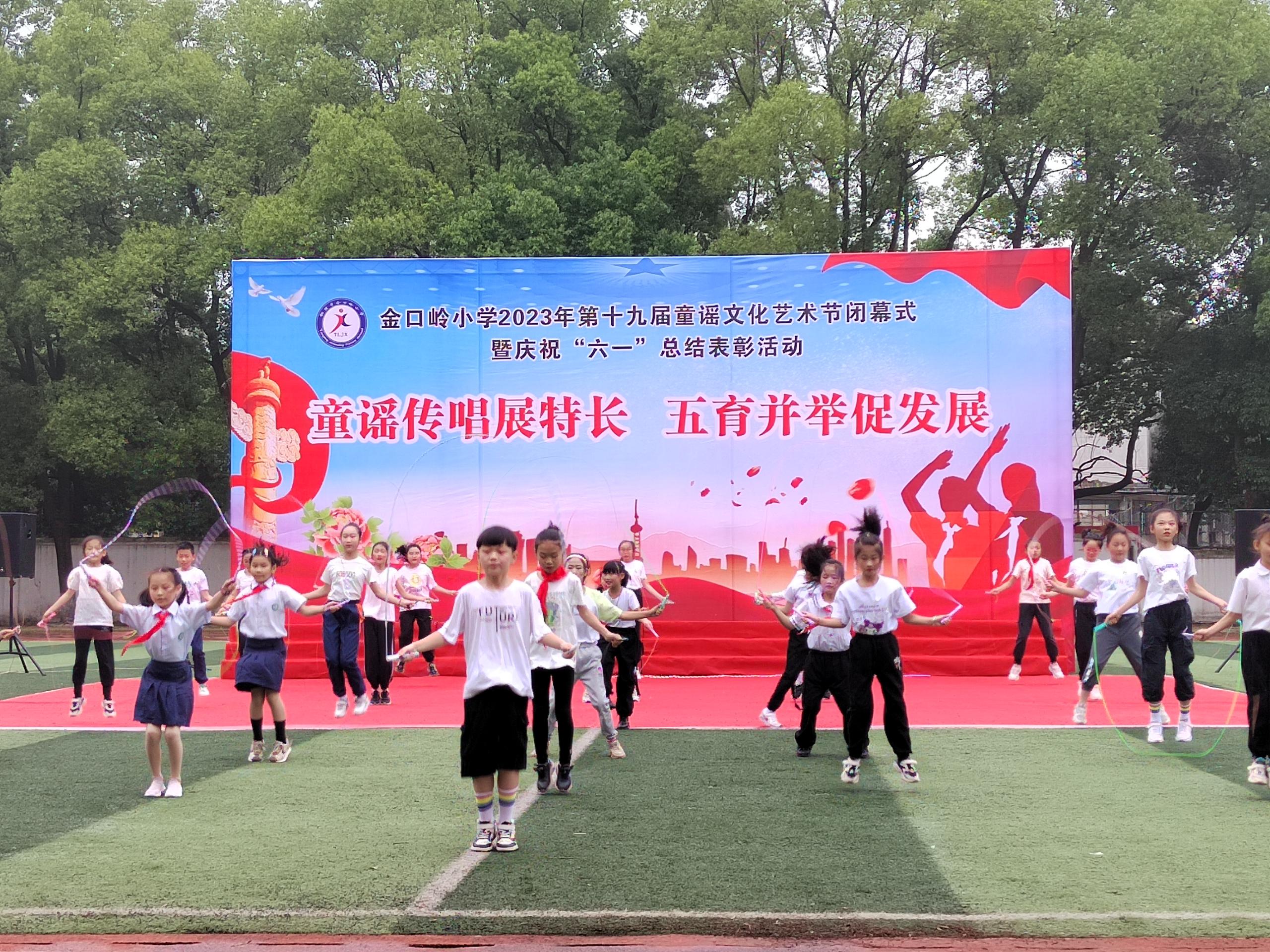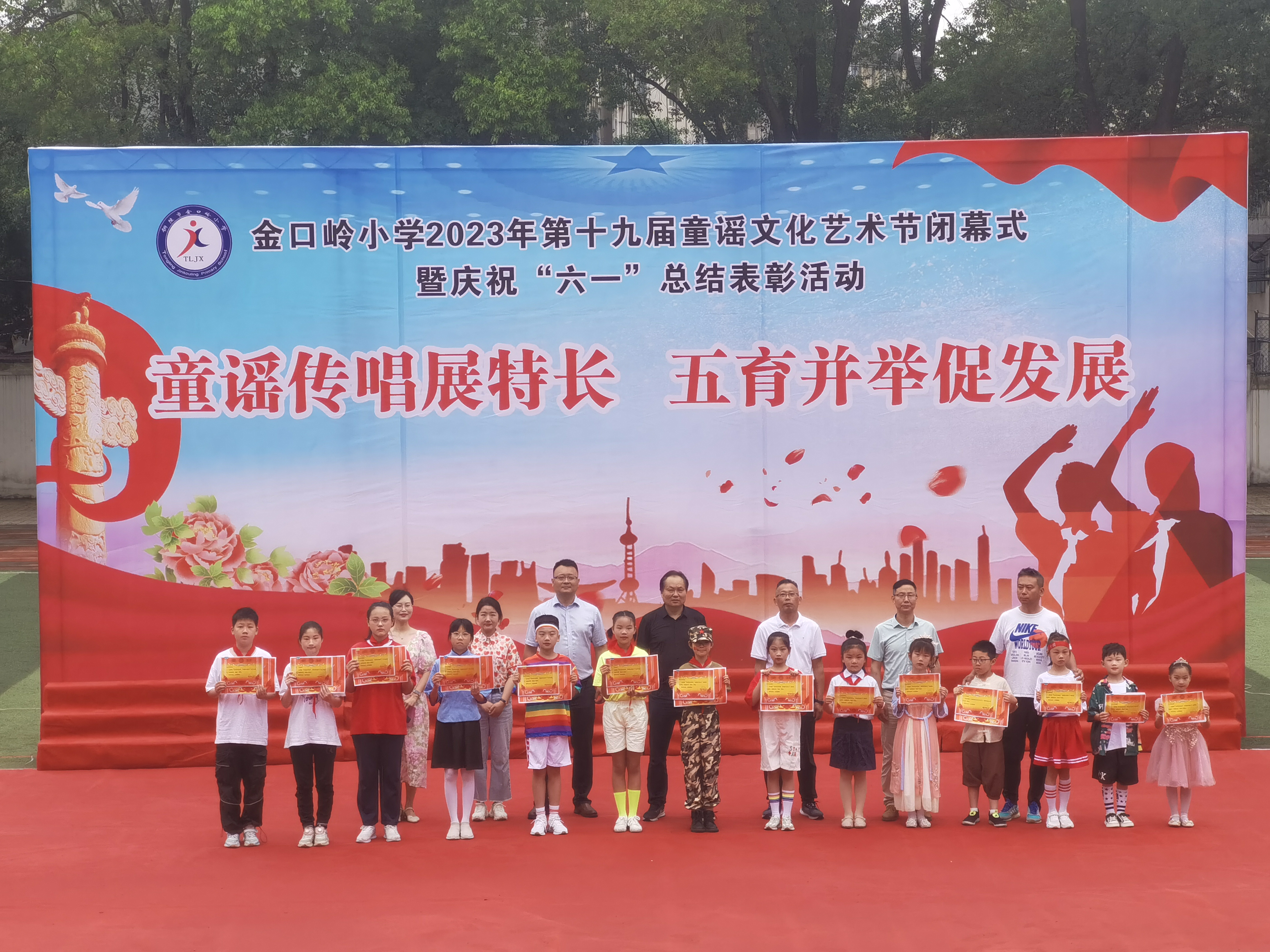 随后,教导主任储燕燕宣布艺术节学生获奖名单,本届童谣文化艺术节共开展活动和比赛27项,共计386人次获奖,储主任对获奖同学表示热烈的祝贺;接着大队辅导员章辉宣读《2023年六一表彰决定》,最后对童谣文化艺术节获奖同学和获得优秀学生干部、优秀少先队员和五好学生等荣誉称号的同学代表予以表彰并颁奖合影留念;颁奖结束后,校长黄言斌宣布校第十九届童谣文化艺术节闭幕。