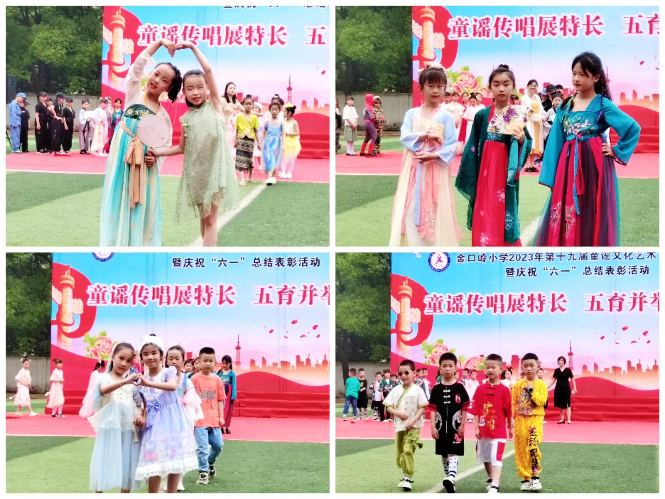 最后,围绕活动主题,庆祝六一文艺汇演在校合唱队《牛歌》《春晓》中拉开帷幕。《2035去台湾》、《青春少年》、《葫芦娃》、《复古disco》、《我们是祖国的花朵》、《沂蒙颂》、《Ginga展示》、《向你奔跑》、《难说再见》、《快乐崇拜》;英语情景剧《拔萝卜》、课本剧《守株待兔》;手势舞《国家》《把未来点亮》;小品《最后一堂课》、健身操《本草纲目》、合唱《稻香》、师生同台走秀《金岭风采,没你不行!》等节目,一个比一个精彩,孩子们的掌声一阵比一阵热烈。