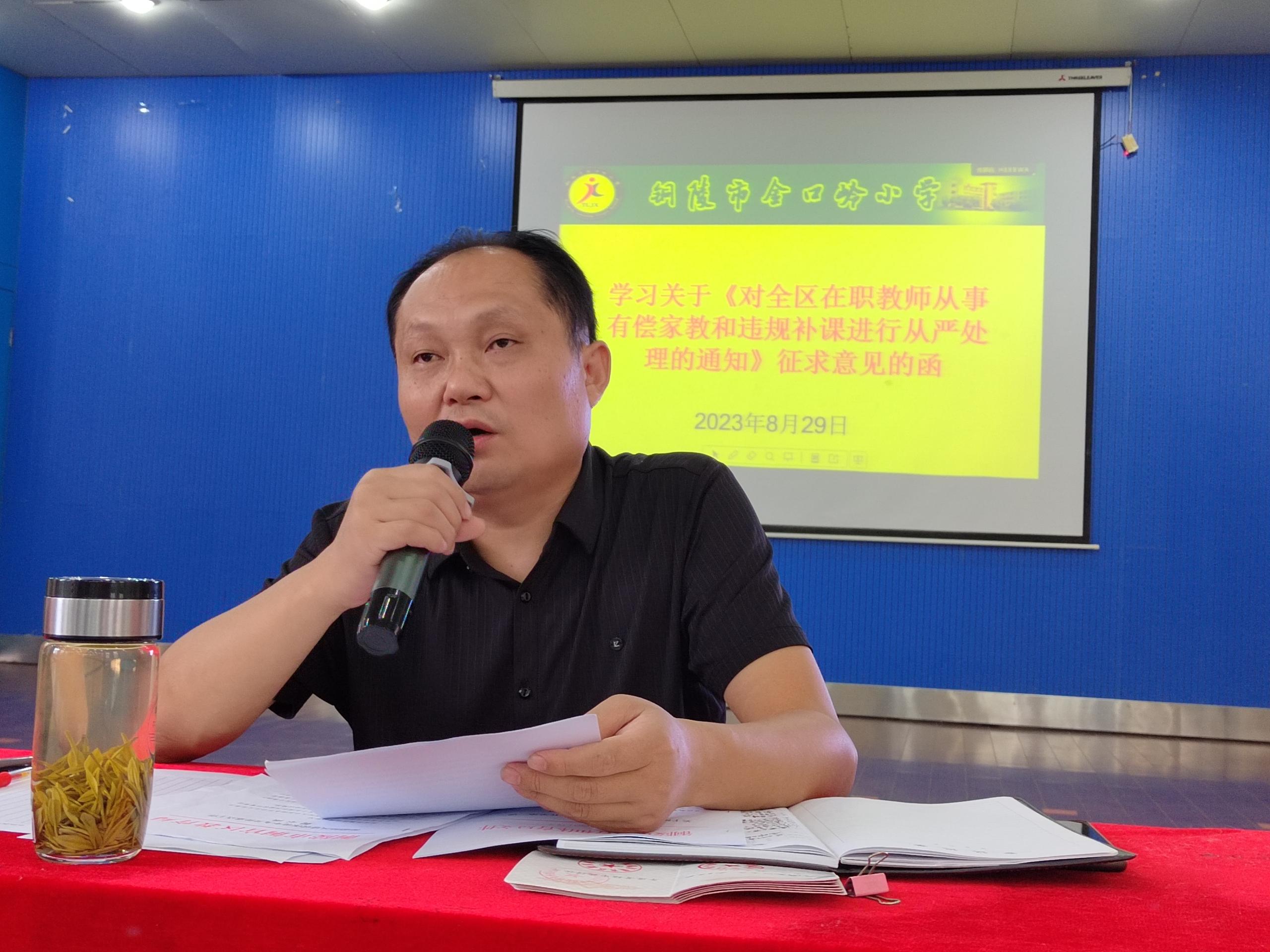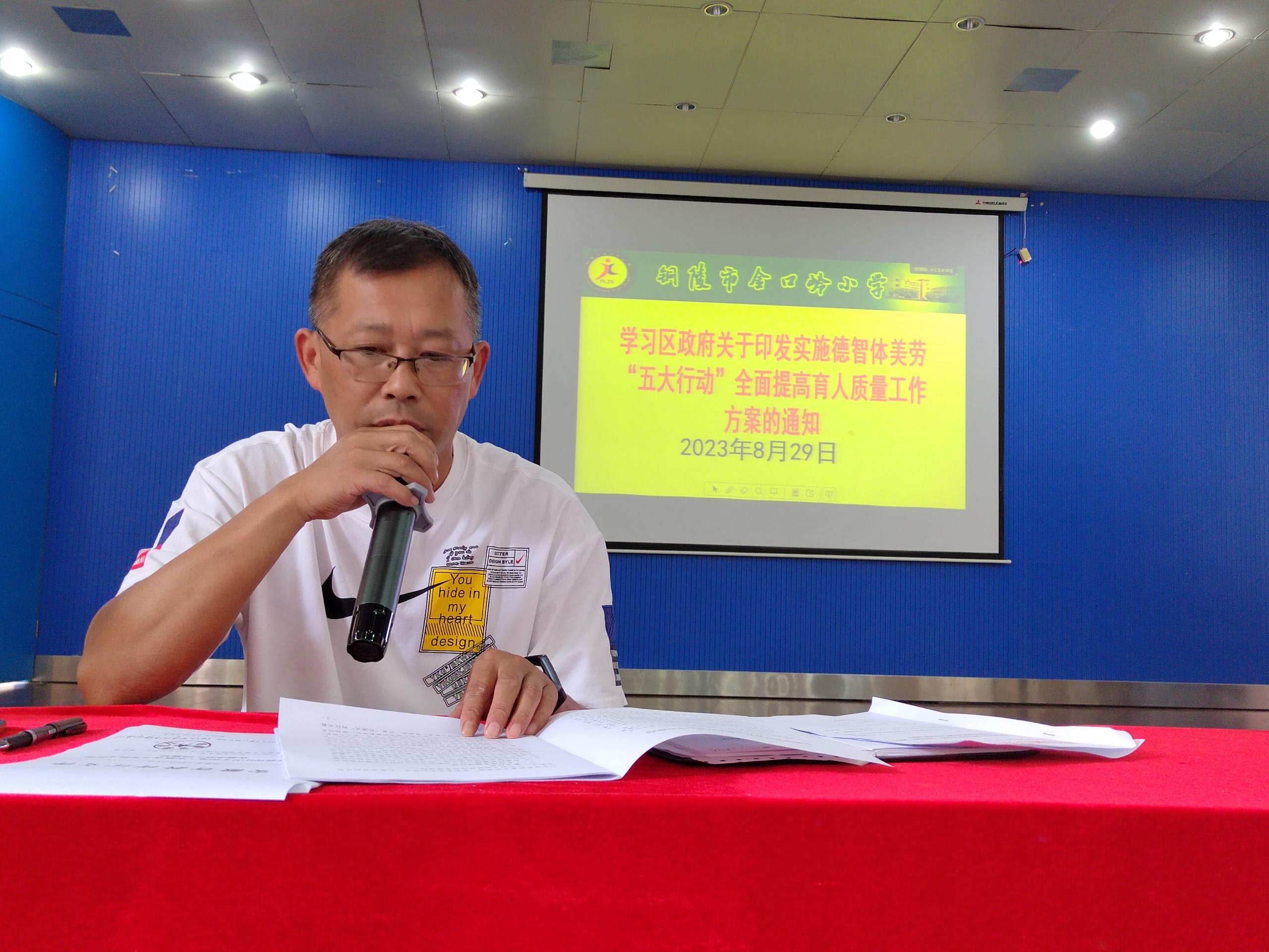 副校长张庆元首先要求老师们提前备好课,从整本书、整个单元角度出发,备教材、备学生、备课堂。全体教师要坚持教学为中心、课堂为重心,继续深化新课标的学习,落实双减政策,减负增效;接着带领全体教师学习铜官区2023年中小学(幼儿园)教师开展继续教育集中培训的通知;最后张校长通知的要求带领全体教师集中学习了安徽省关于印发《安徽省义务教育课程实施办法》的通知、铜官区人民政府关于印发实施德智体美劳“五大行动”全面提高育人质量工作方案的通知。