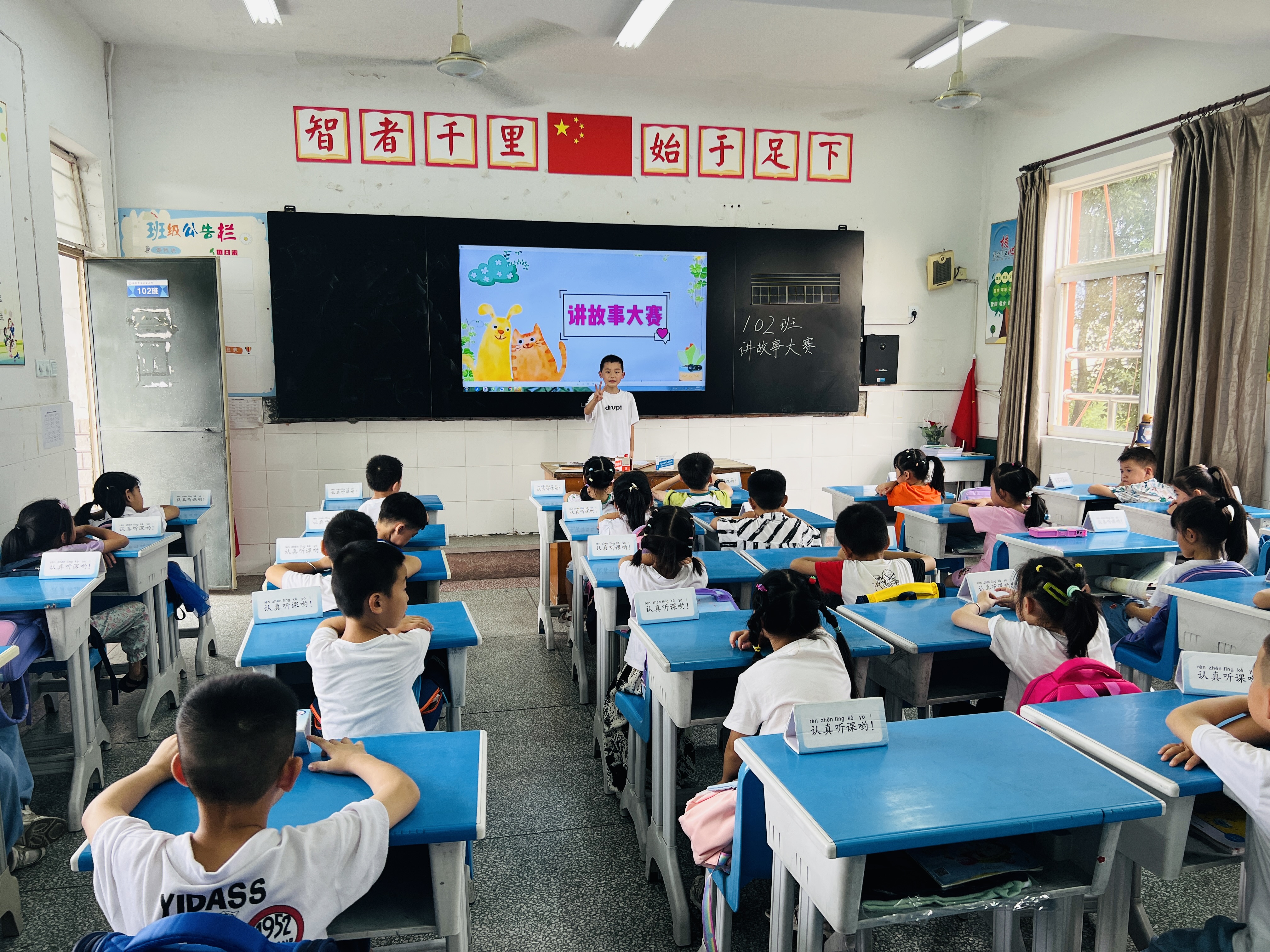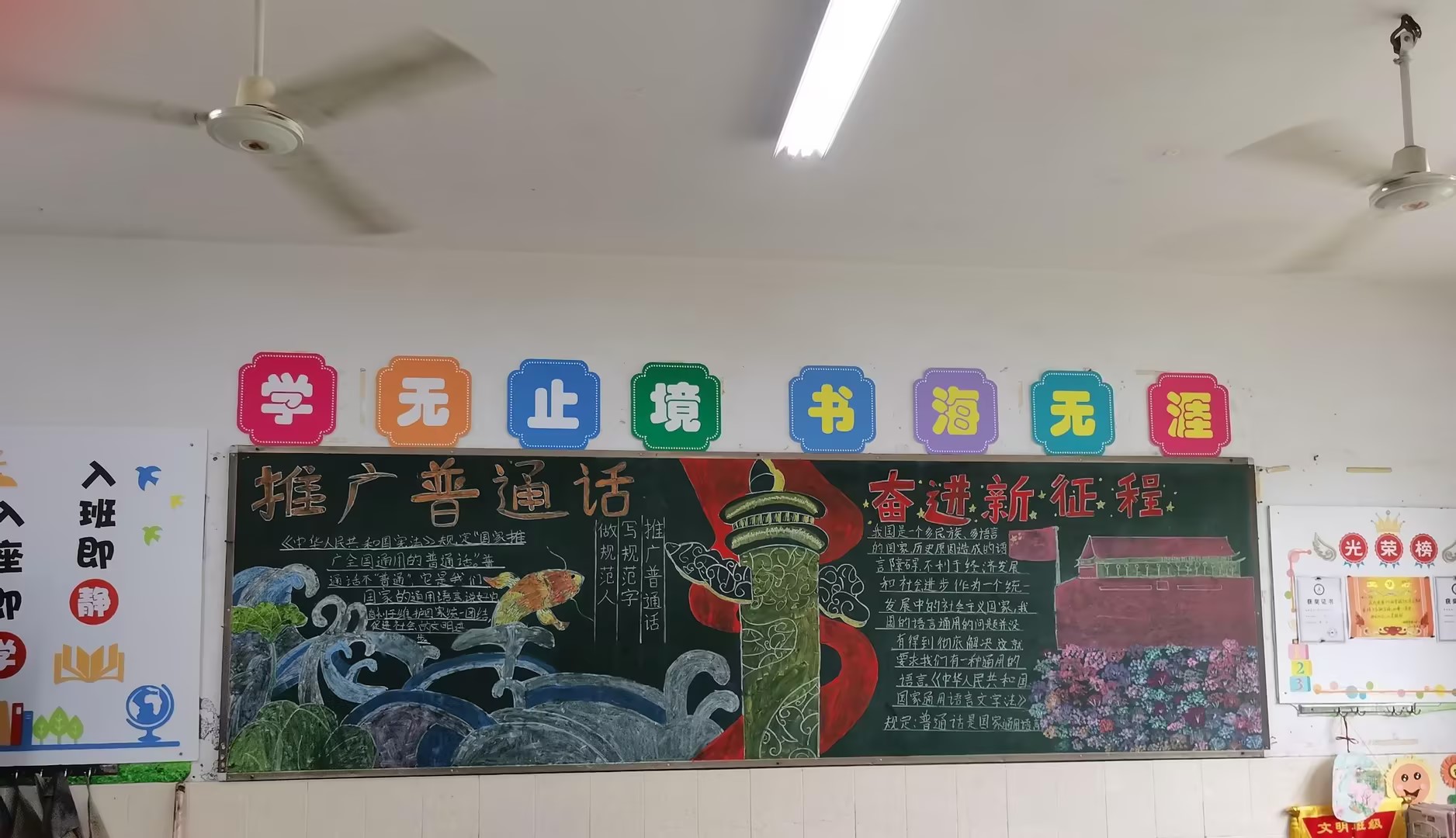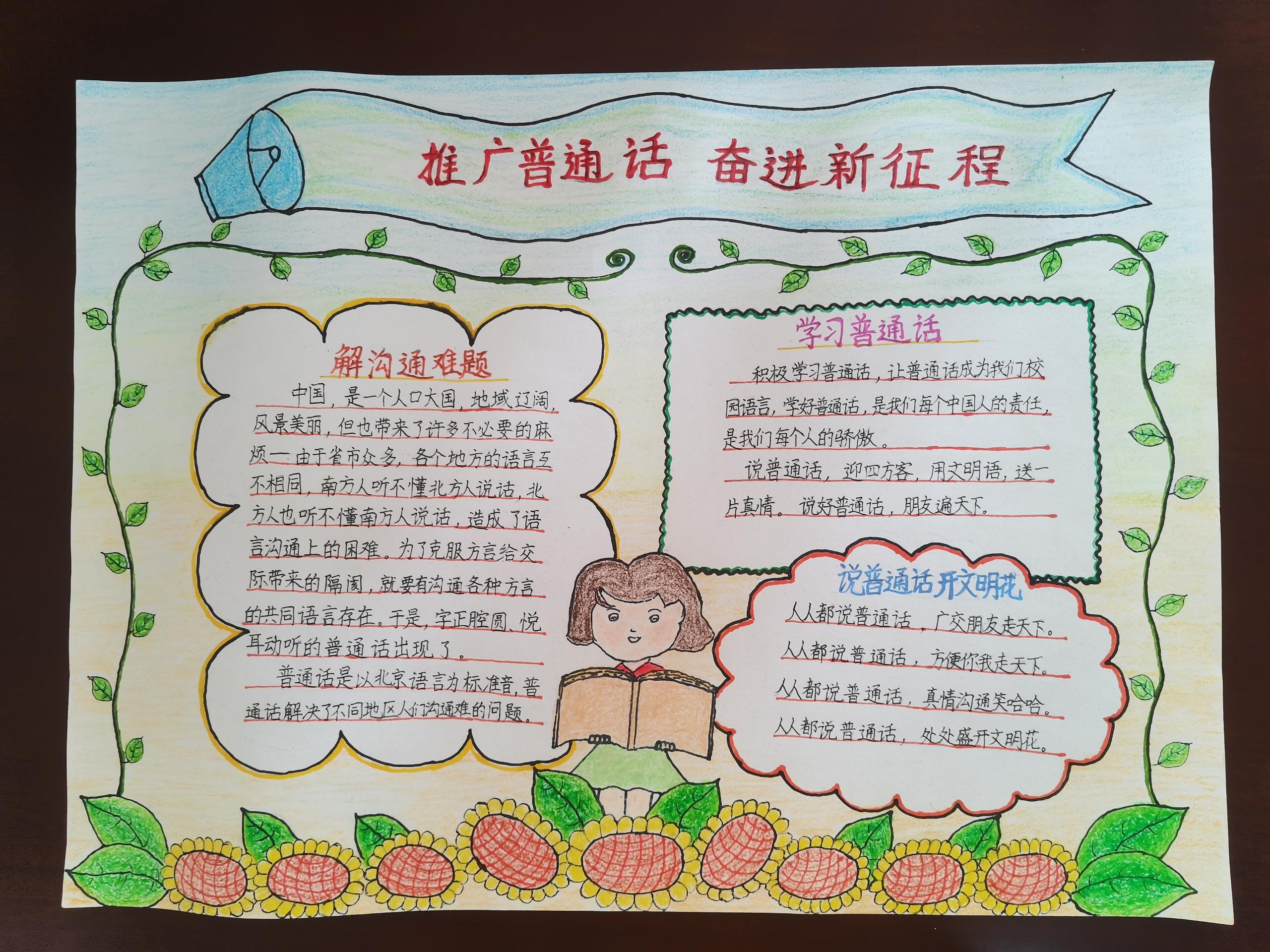 接着,在全校范围内开展了以“推广普通话,奋进新征程”为主题的系列活动,包括主题班会、好书分享会、讲故事比赛、规范汉字书写大赛、千人诵读、主题黑板报、主题手抄报等,用多种形式激发学生学好普通话,推广普通话。