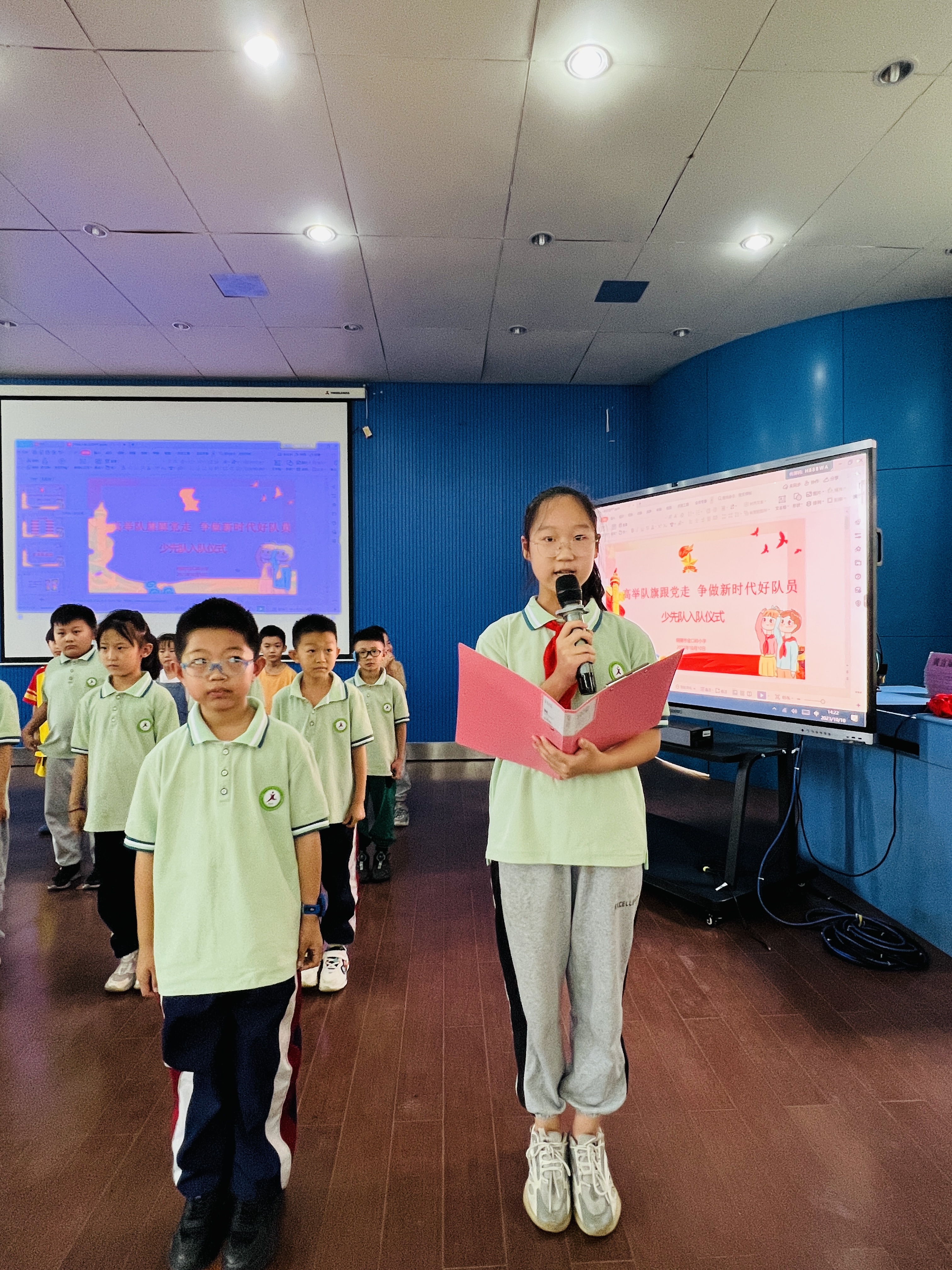 主持人宣布活动开始,旗手与护旗手伴随着激情昂扬的出旗曲,迈着整齐的步伐,雄赳赳、气昂昂地走来,新队员入队仪式由此拉开帷幕。
