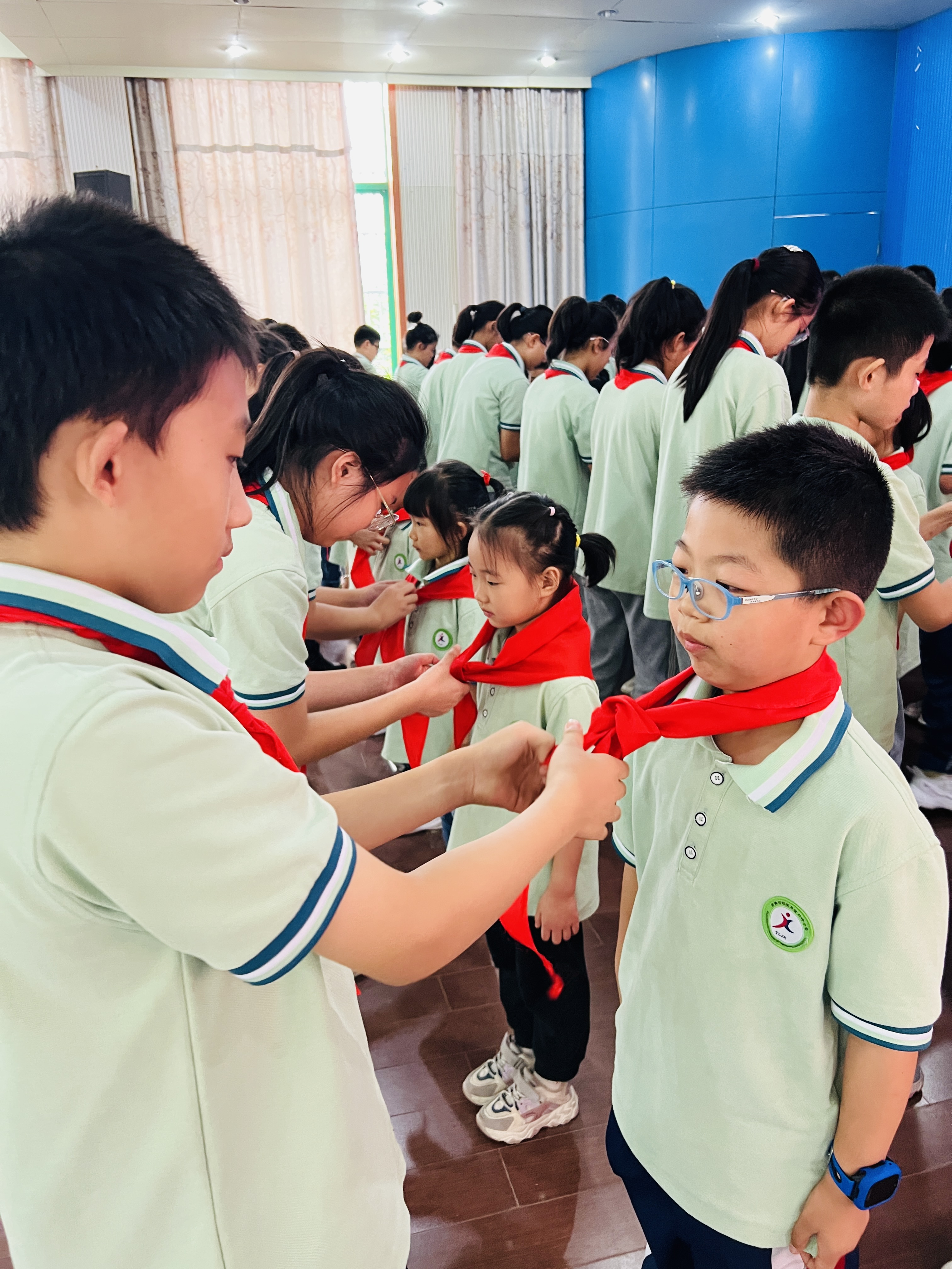 学校少先队大队辅导员贾丽老师宣读了入队新队员名单,共有43名同学加入了少先队组织,为少先队这个大家庭注入了新的活力。随后,六年级的老队员们手捧一条条鲜艳的红领巾为一年级新队员佩戴红领巾,新老队员互敬队礼,寓意着星星火炬,代代相传,新老队员们的情感紧紧相连。
