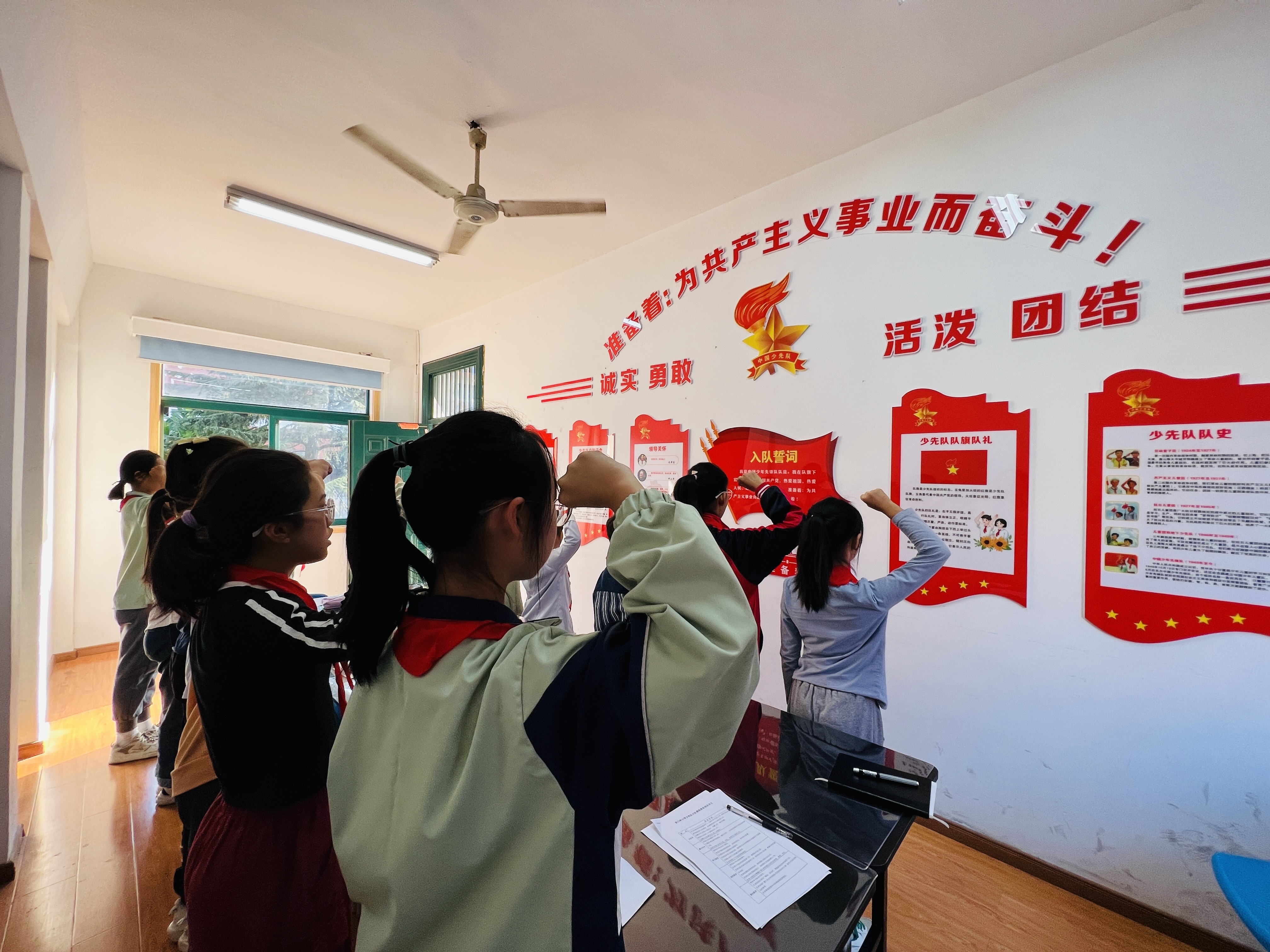 会议第三项,大队长张羽汐同学带领全体大队委庄严宣誓,一声声铿锵有力的宣誓声,表达了他们将做好少先队工作的坚定决心。