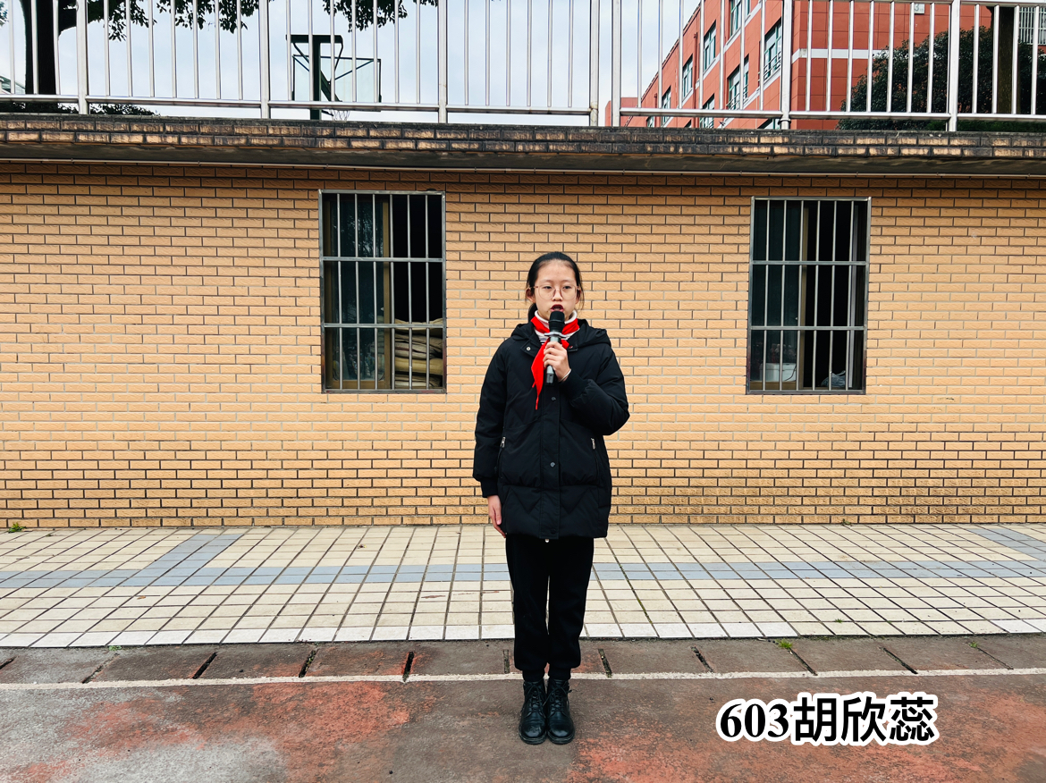 我是六0三班的胡欣蕊。今天我国旗下演讲的主题是《与法同行 快乐成长》。