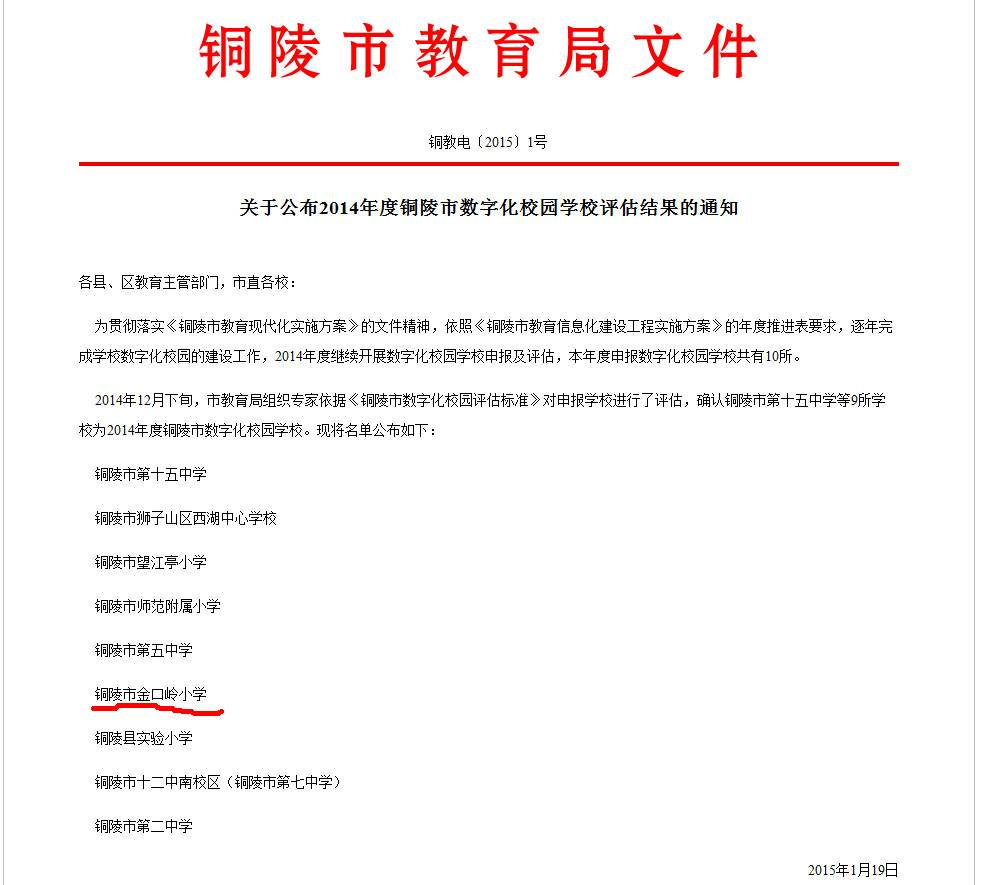 在刚刚公布的2014年度铜陵市数字化校园学校评估结果中获悉,我校成功评选为“铜陵市数字化校园”,这标志着我校信息化建设迈上一个新台阶。