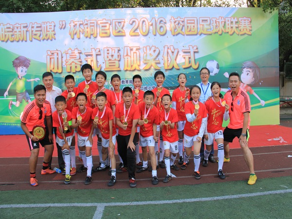 砥砺前行迎难上,足球征程添新彩。6月17日下午,随着裁判员终场哨响,经过50分钟的激烈角逐,我校足球队以2:0的比分战胜杨家山小学代表队,获得了“皖新传媒”杯铜官区2016校园足球联赛冠军。