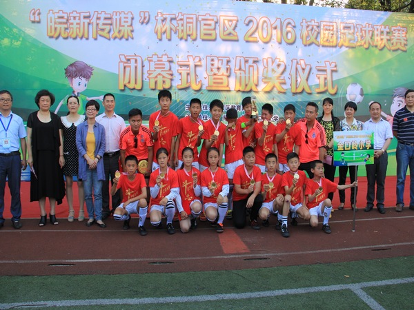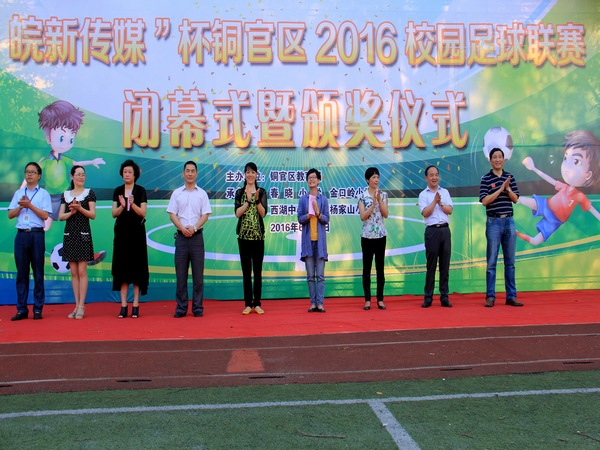铜官区副区长陈爱民,铜陵市教育局副调研员王红,铜陵市体育局副调研员、群体科科长万方,铜官区教育局党工委书记、局长黄建平,铜官区体育局局长谢贵祥,铜官区教育局党工委副书记、副局长向满和,铜官区教育局副局长阮贵荣,铜陵市新华书店副总经理吴劲松,德彩网党支部书记、校长胡朋贵等出席闭幕式,并为获奖球队和个人颁发奖杯和奖牌,合影留恋。