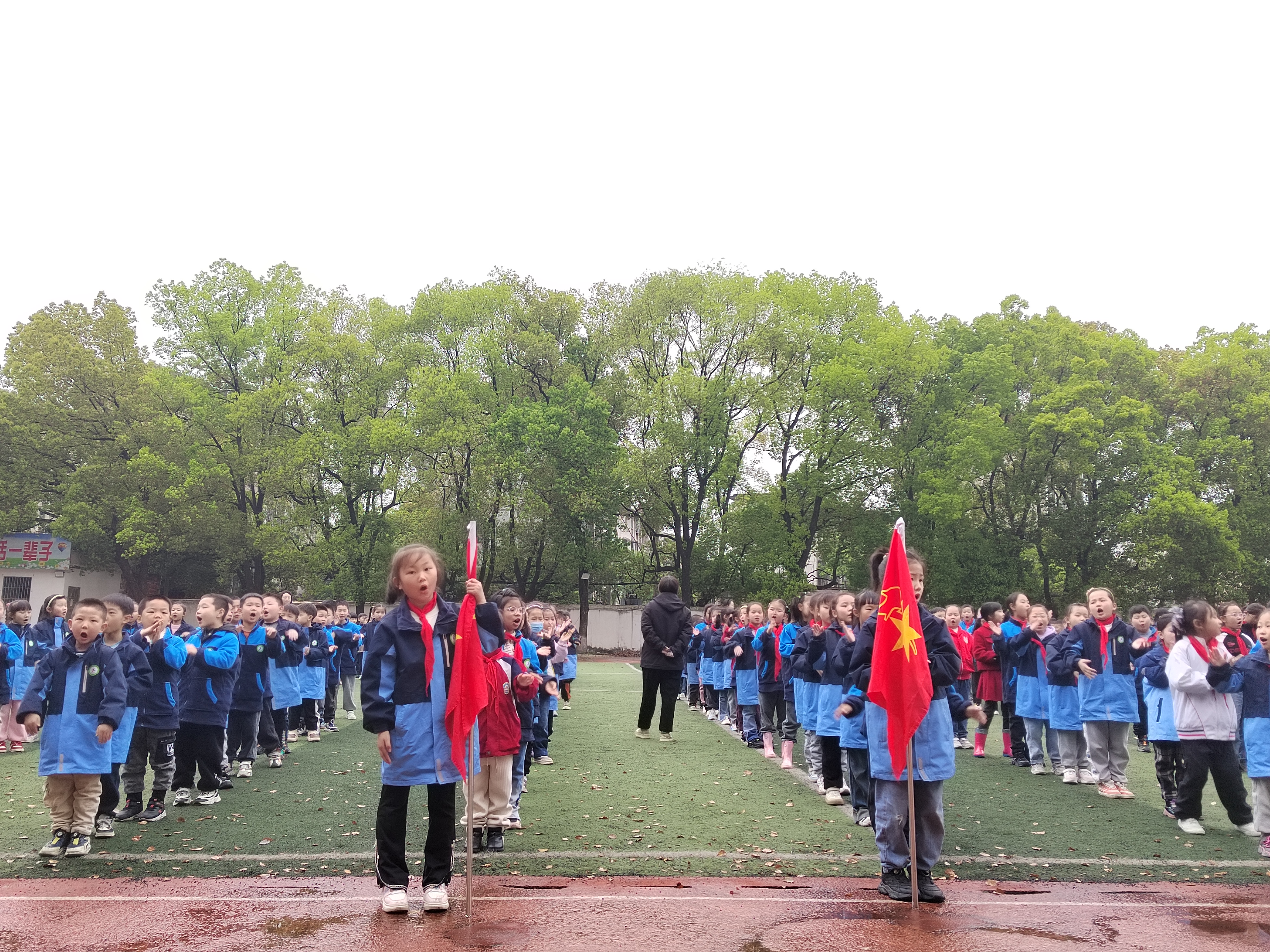 开幕式上,首先进行庄严的升旗仪式,接着全校同学表演了千人诵读《山谷里有座烈士墓》《寒食》《清明》。601班黄左妍同学代表全体同学发言。