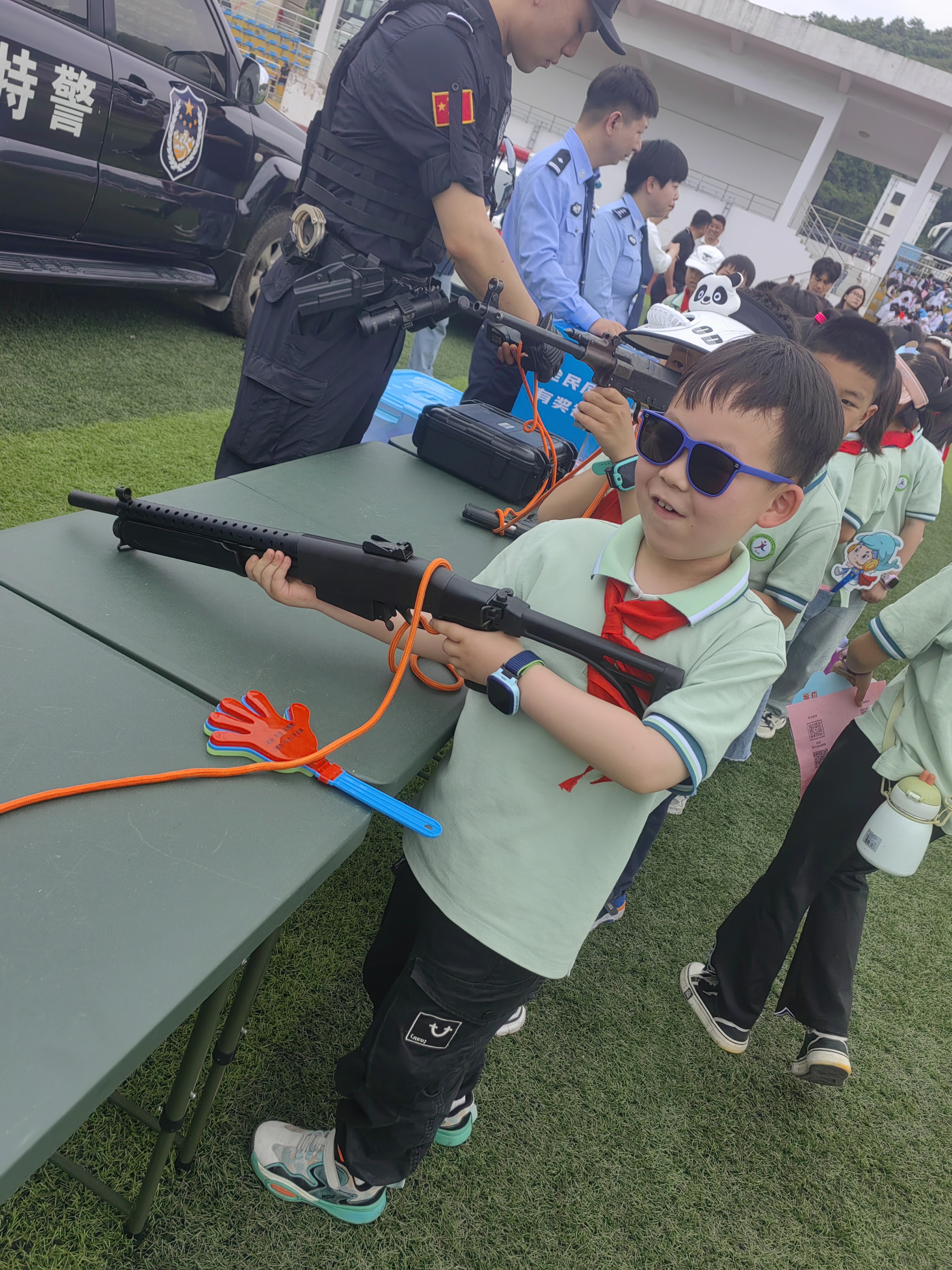 今天是铜陵公安警营开放日,于是我们二年级代表全校参加了这次活动。一路上我们欢声笑语。一开始,主持人为我们举行了号码兑奖活动,有警察叔叔的摩托车进行特技表演、警犬表演、反诈宣传、解救人质、制服歹徒……这些节目都赢得了同学们的阵阵掌声,大家欢呼雀跃,为这些精彩的表演而呐喊。其中最令我感兴趣的是武器参观,其中我发现武器的类型有5种,分别是电击枪、手枪、冲锋枪、霰弹枪、狙击枪。我还看见两把狙击枪,其中有一个是AWM狙击步枪,号称狙击大王;还有一把SVD狙击枪。当我把这些枪械的类型和名字说出来的时候,同学们都说我是武器专家。我想其他小朋友的收获一定比我还多。