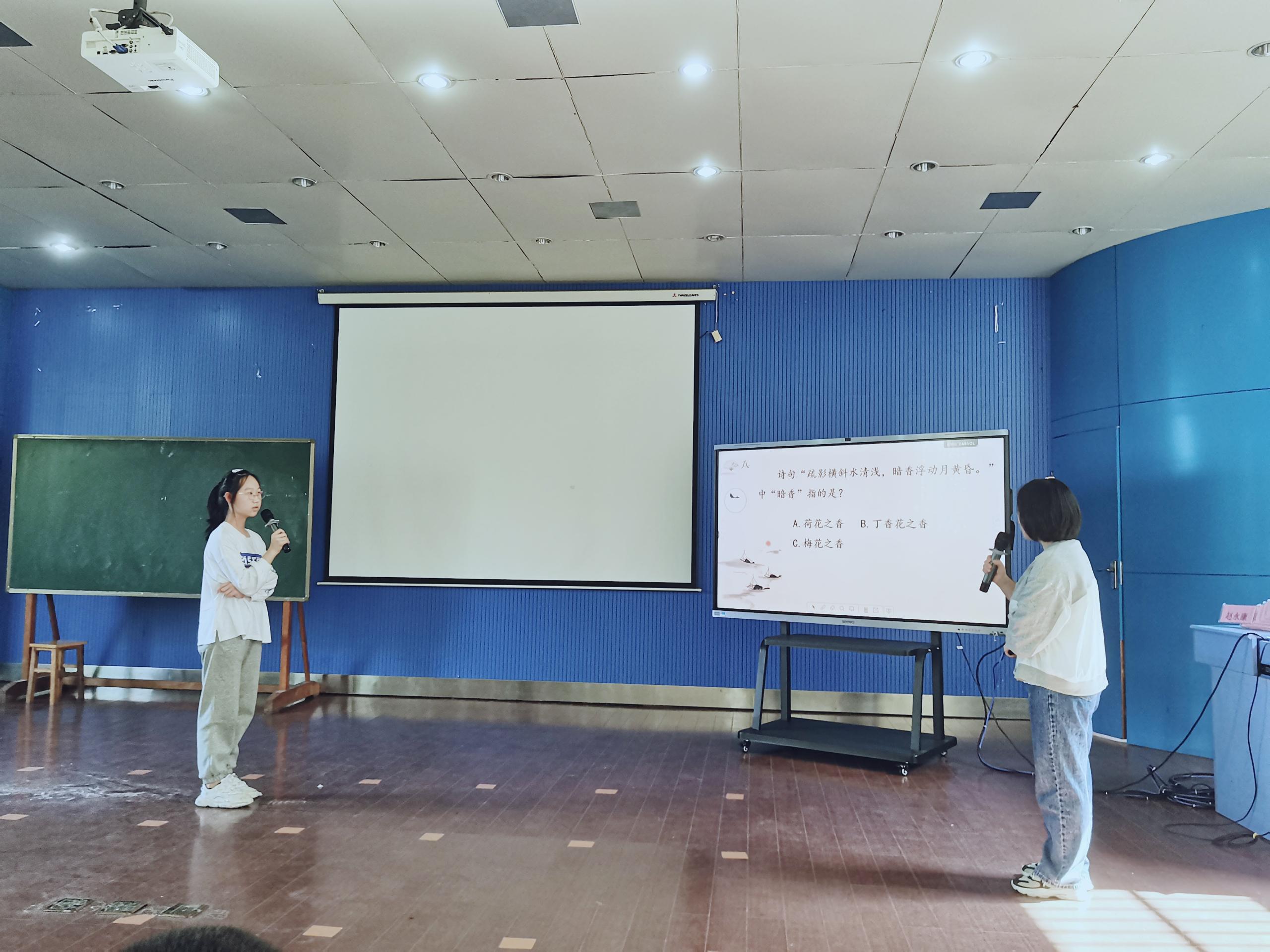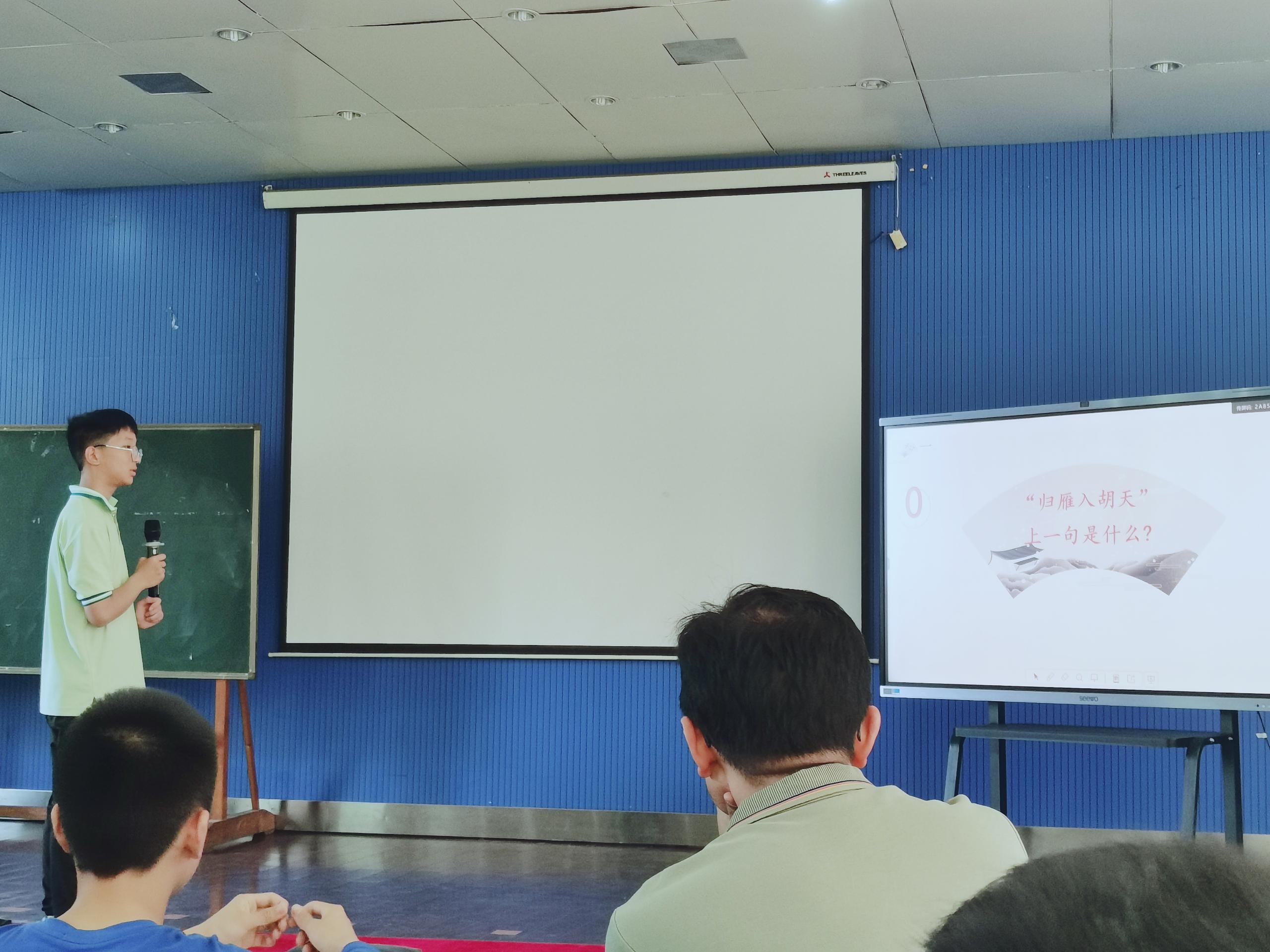 比赛分为初赛和复赛共两轮,初赛为笔试,复赛包含必答题、抢答题、飞花令三个环节。比赛开始后,选手们在台上正襟危坐,大家你来我往,佳句频出,高潮迭起,赢得了阵阵掌声,将现场气氛一次次推向高潮。观众们也屏息凝神思索着答案,并不时地在纸上书写答案。经过激烈角逐,602班张羽汐和601班罗照航两位同学获得了冠军。