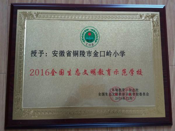 近日,我校喜获2016年度“全国生态文明教育示范学校”荣誉称号。这是我校继省级“绿色学校”后,在环境教育方面的首个国家级荣誉,也是2016年度铜陵市唯一取得这一殊荣的学校。“全国生态文明教育示范学校”评选活动是由中华人民共和国环保部主管的中国环境文化教育专家委员会及《环境教育》杂志社发起,通过材料申报、专家评审、中国环境教育网公示等流程,我校最终荣膺这一称号。