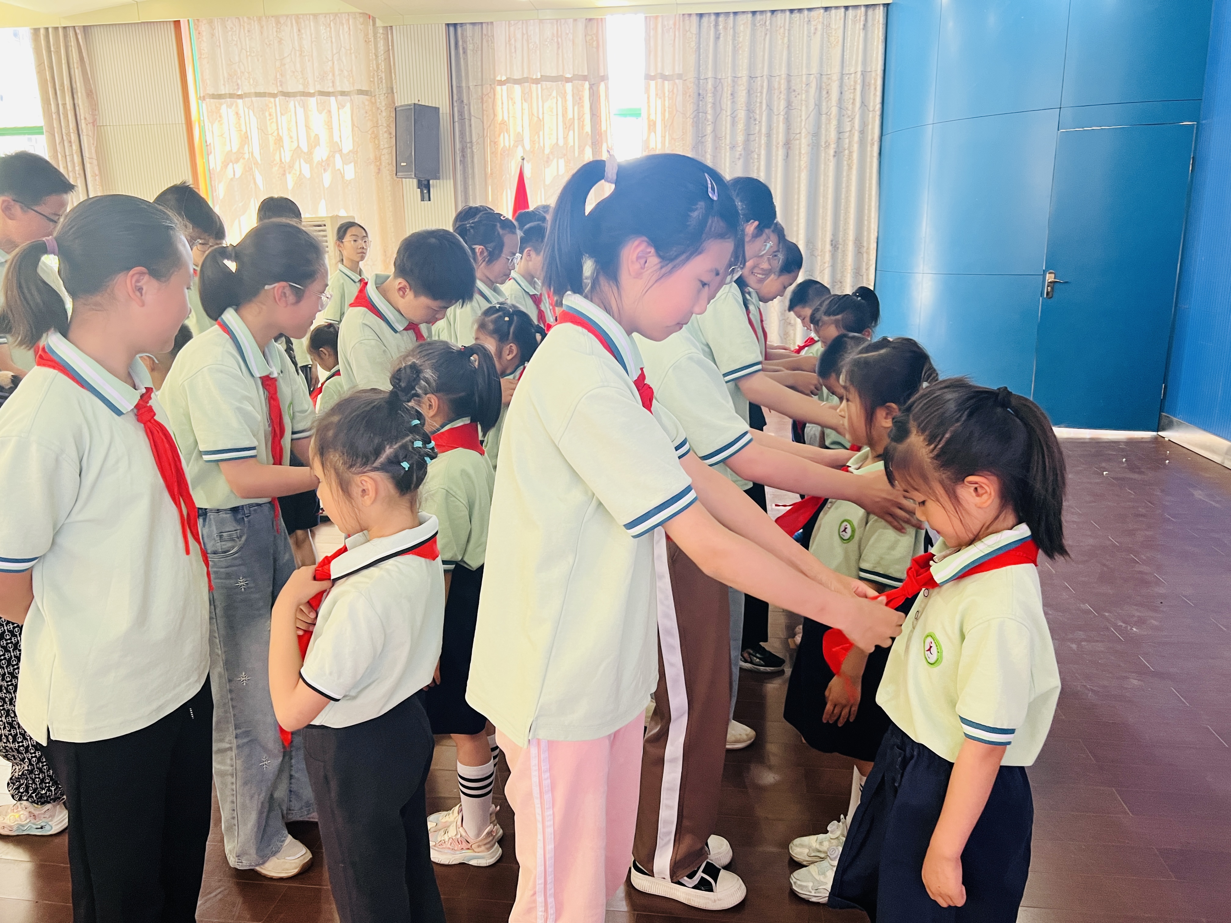 随后,六年级的老队员们代表手捧一条条鲜艳的红领巾为一年级新队员佩戴红领巾,新老队员互敬队礼,寓意着星星火炬,代代相传,新老队员们的情感紧紧相连。