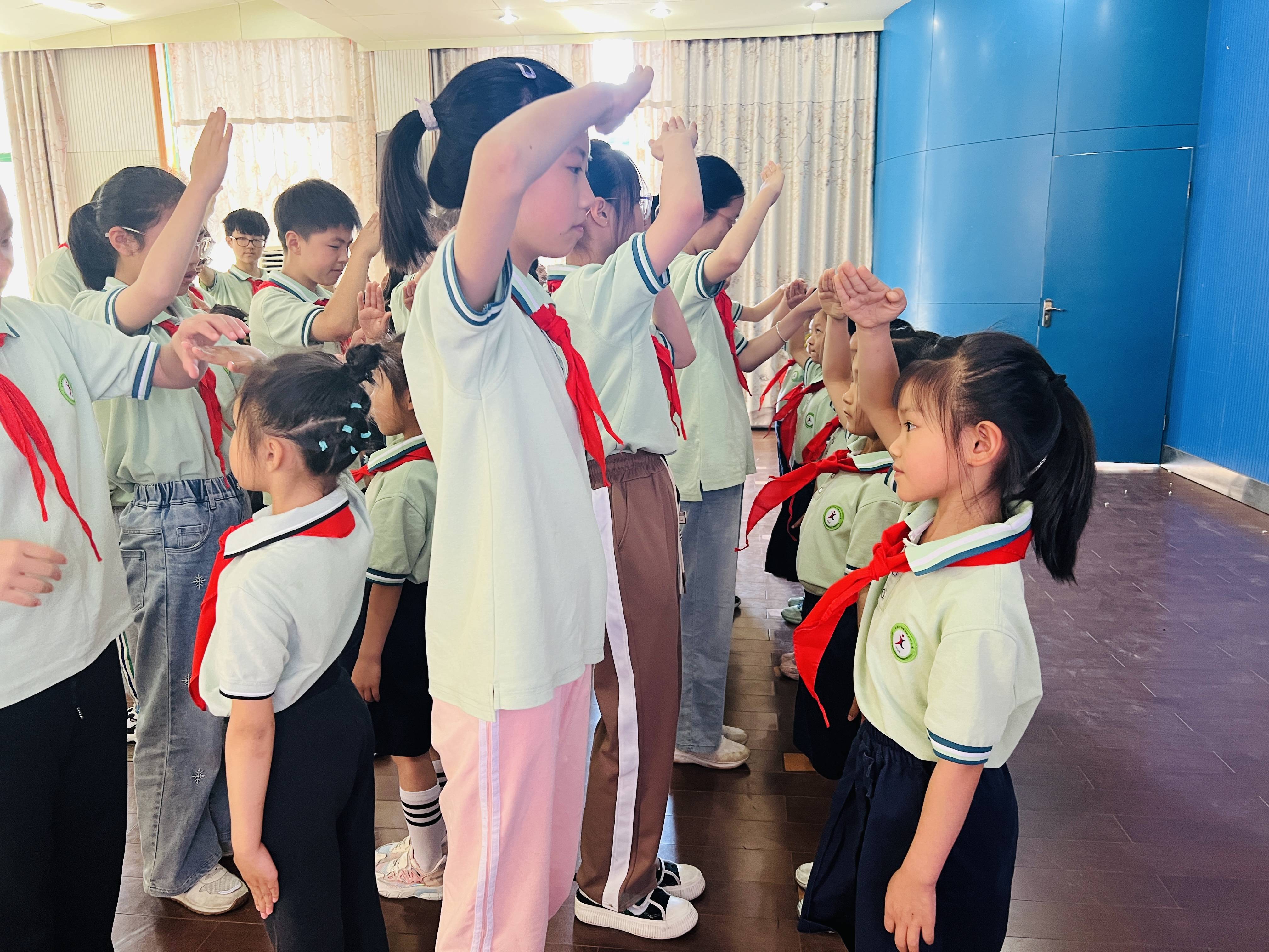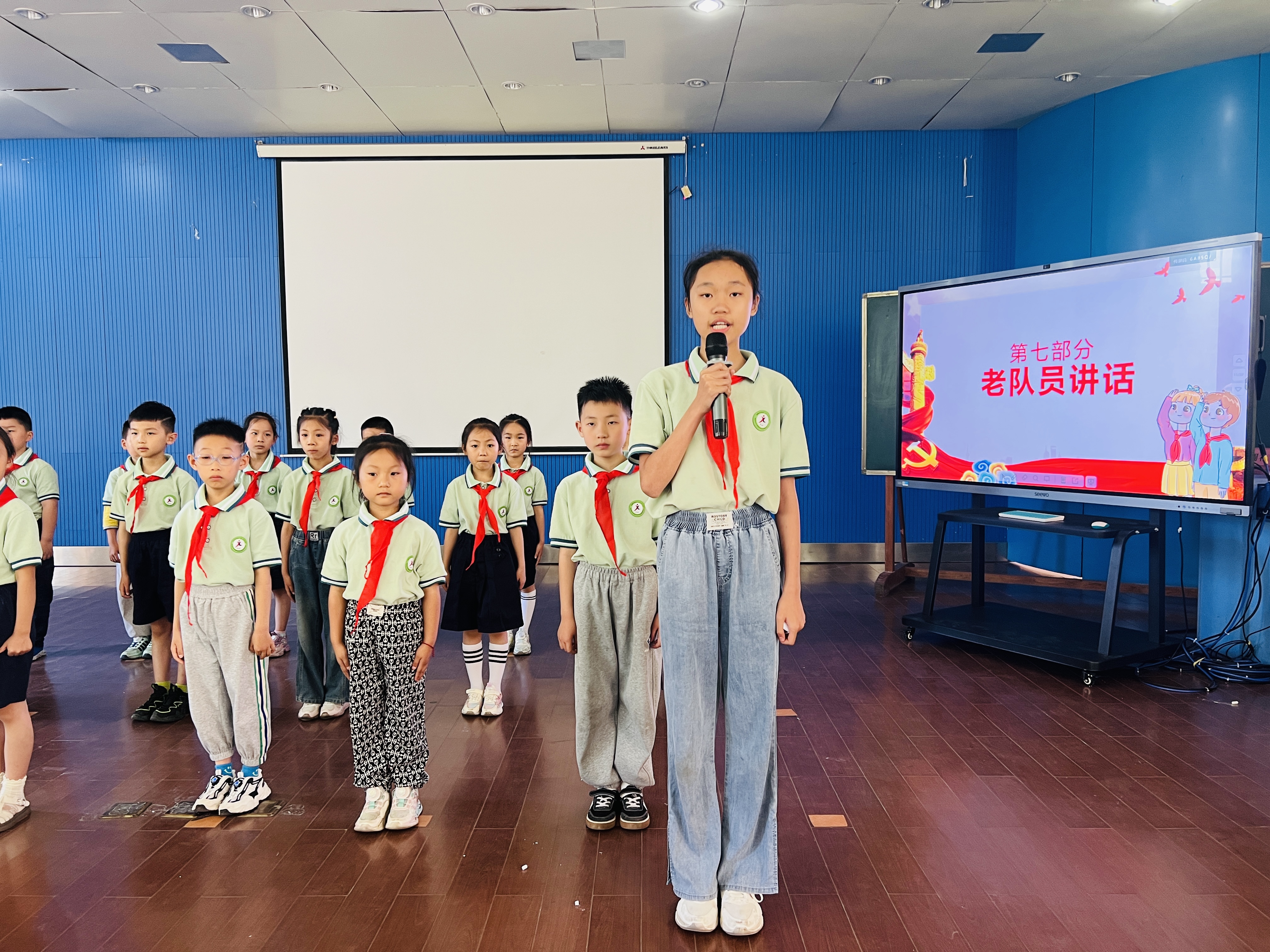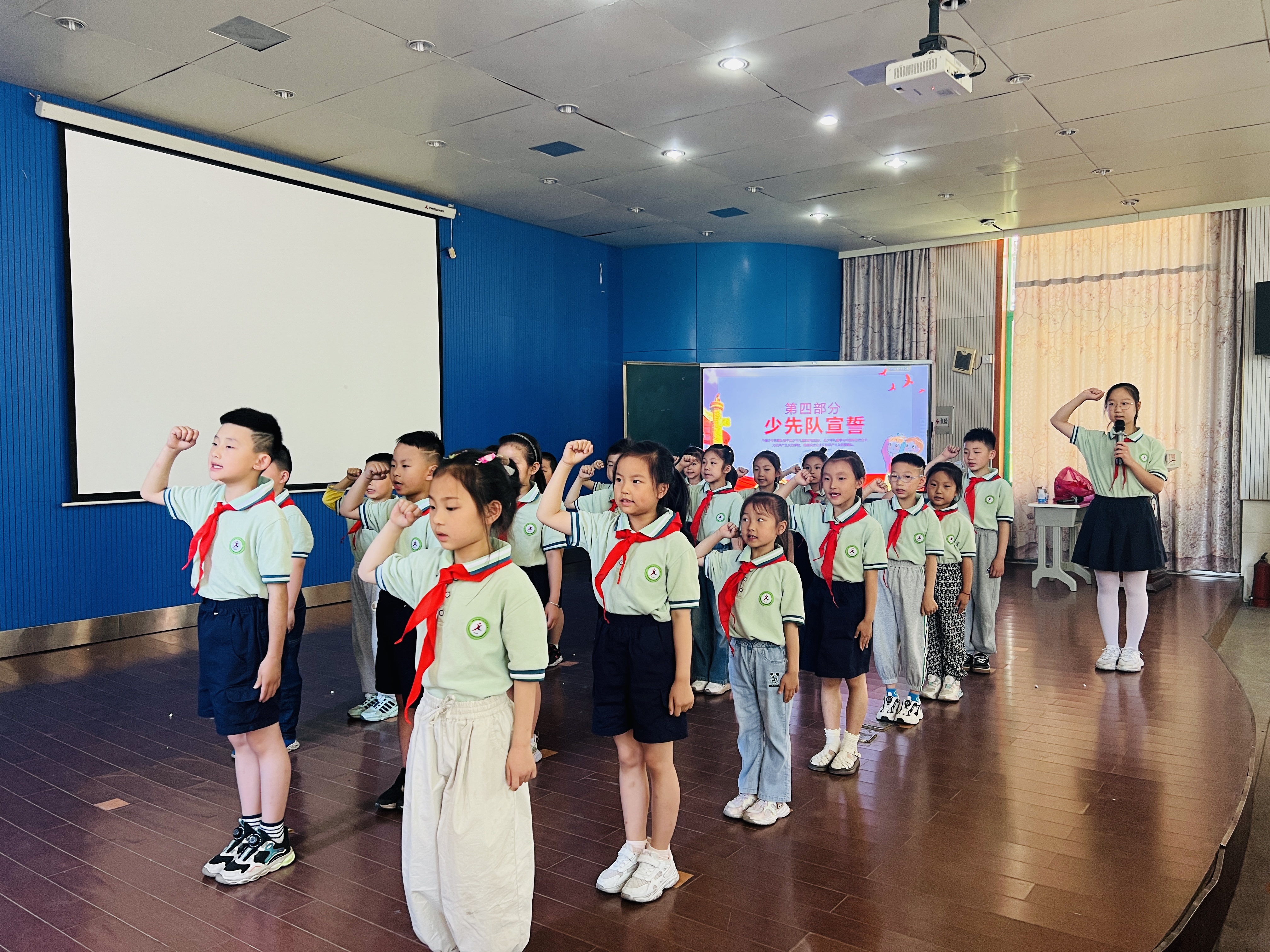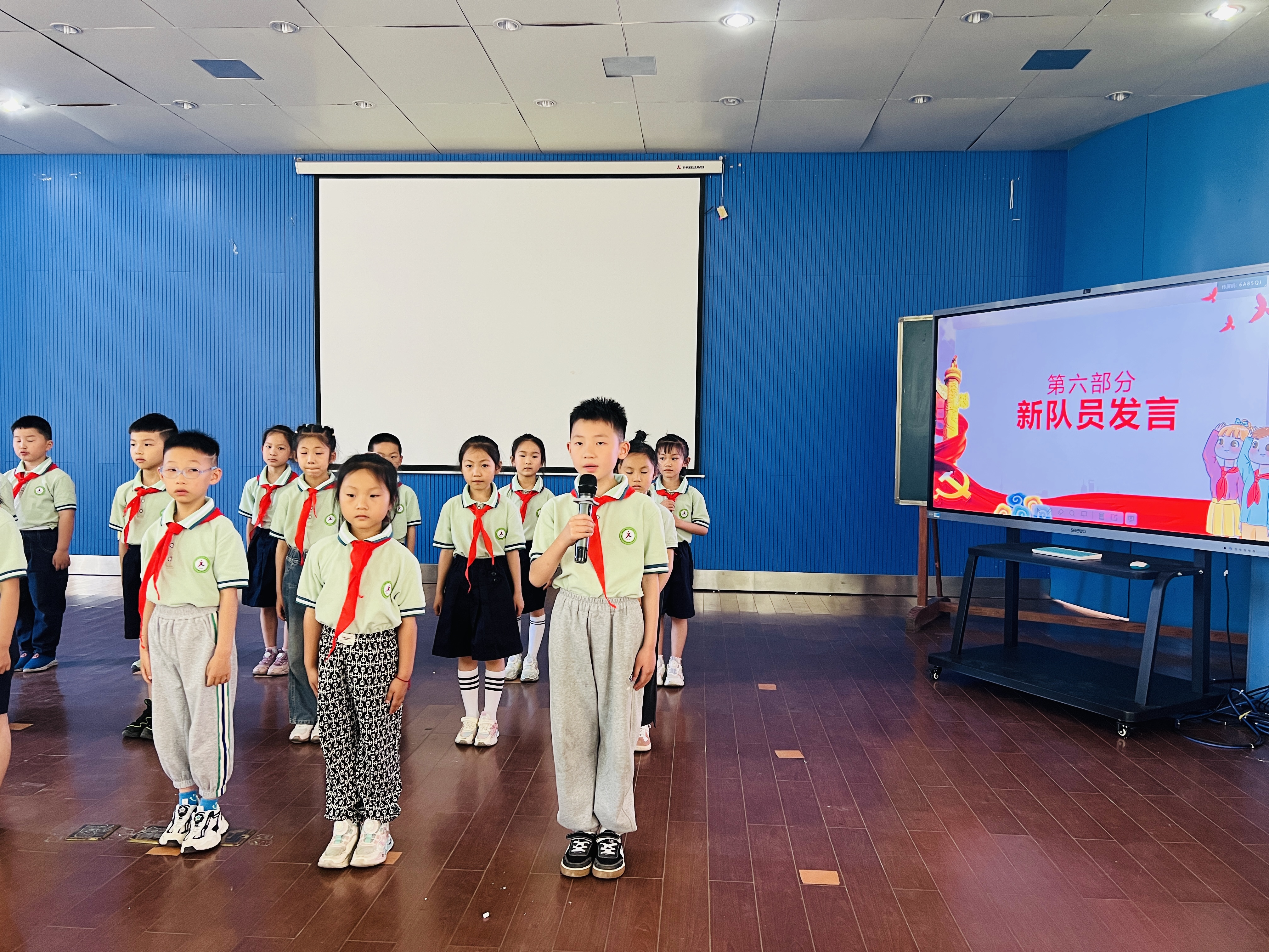 在鲜艳的队旗下,新队员们高举右手,一起庄严宣誓:“我是中国少年先锋队队员。我在队旗下宣誓:我热爱中国共产党,热爱祖国,热爱人民,好好学习,好好锻炼,准备着:为共产主义事业贡献力量!”