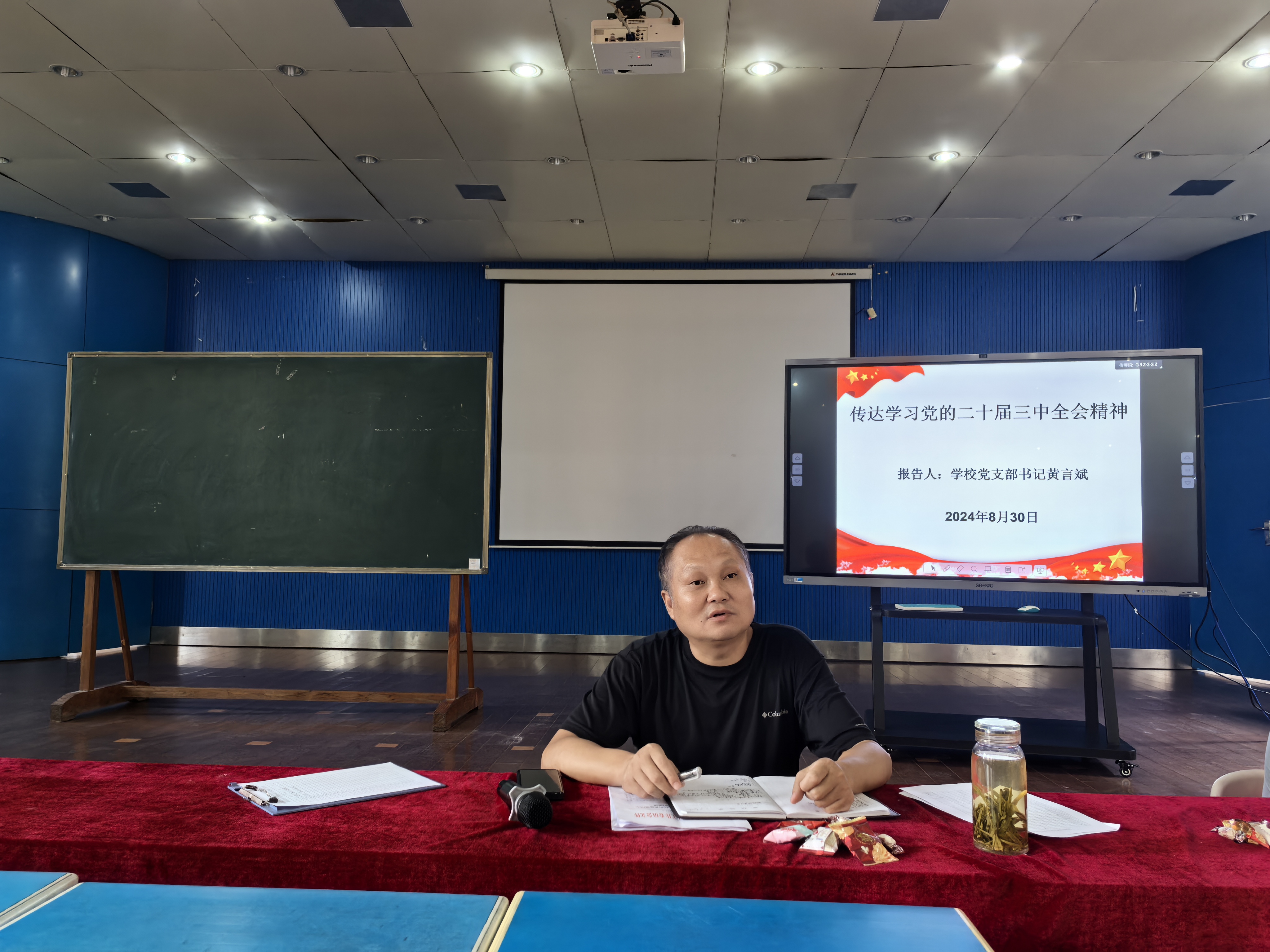 2024年8月30日下午学校召开全体教师大会。会上,支部书记黄言斌带领大家认真学习贯彻党的二十届三中全会精神,黄书记从深刻认识全会的重大意义、深入学习领会习近平总书记在全会上的重要讲话精神、全面准确理解全会《决定》提出的进一步全面深化改革重大举措、抓好全会精神贯彻落实等四个方面谈了自己的学习体会。