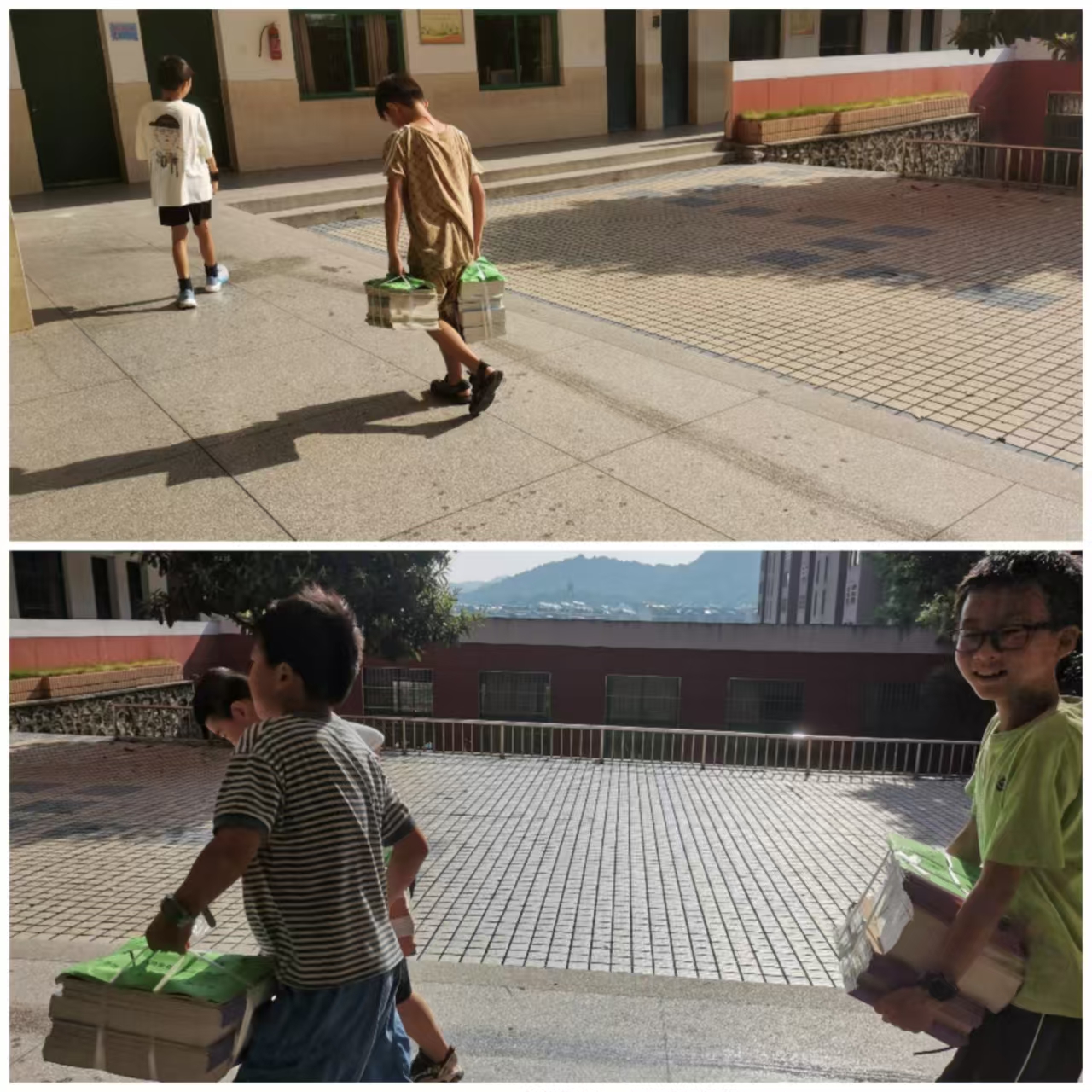 蹲下,清点、搬运、帮忙,散发着墨香的新书在孩子们的手中四溢。大家按科目有序分类、发放、核对。虽然累得满头大汗却也笑意盈盈。