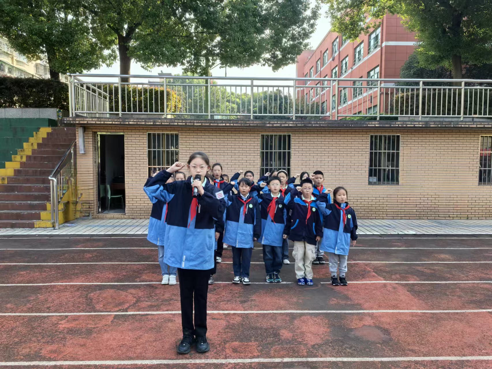 最后,大队辅导员张老师带领全体师生进行呼号:“准备着,为共产主义事业而奋斗!”“时刻准备着!”