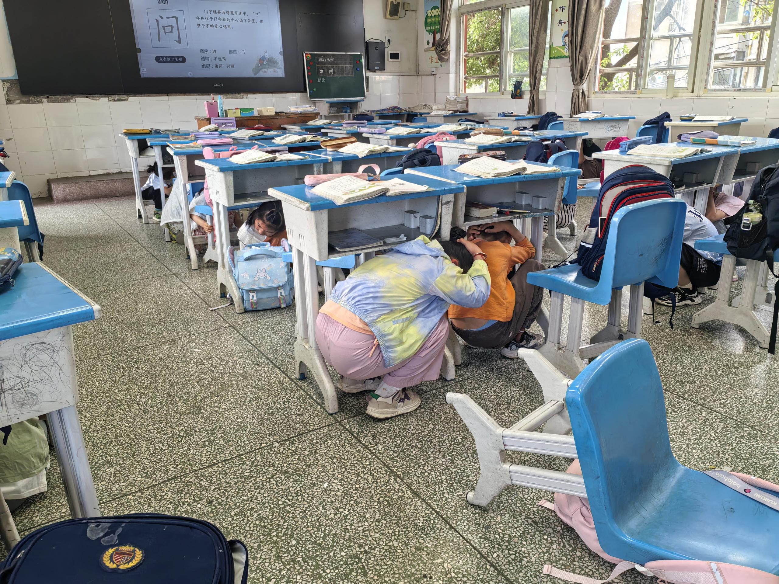 上午9时,随着警报声响起,演练正式开始。各班教师迅速反应,指挥学生采取“伏地、护头、抓牢”的避险姿势,完成30秒紧急避险。随后按照预定疏散路线有序撤离教室。楼道值守教师全程引导,确保通道畅通,避免拥挤。仅用时3分17秒,全校师生全部安全抵达操场指定区域,班级负责人迅速完成人数清点并逐级上报。演练过程中,师生动作规范、配合默契,展现了良好的应急素养。