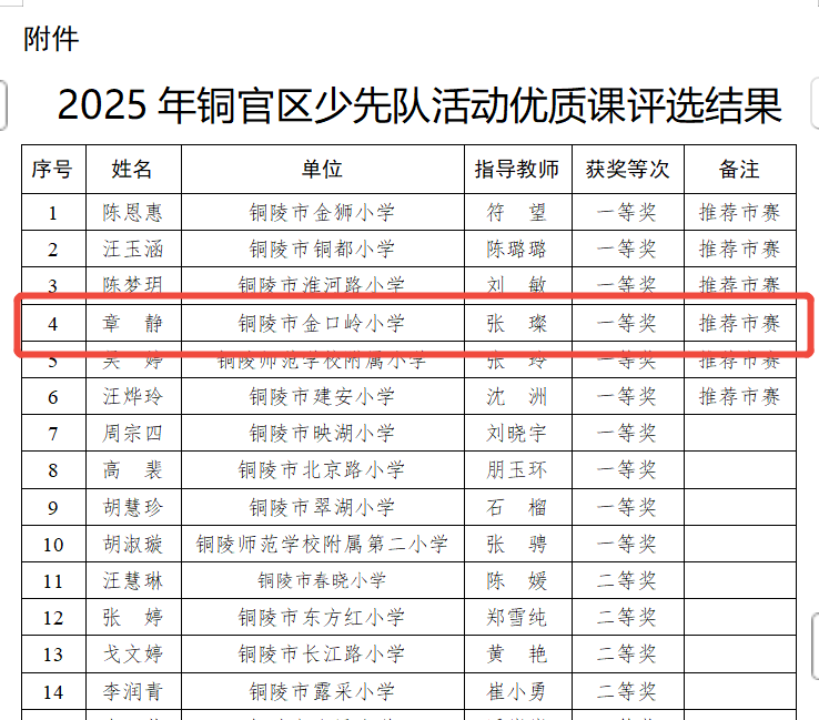 我校章静老师参加2025年少先队活动优质课评选活动中分获区级一等奖,市级二等奖。