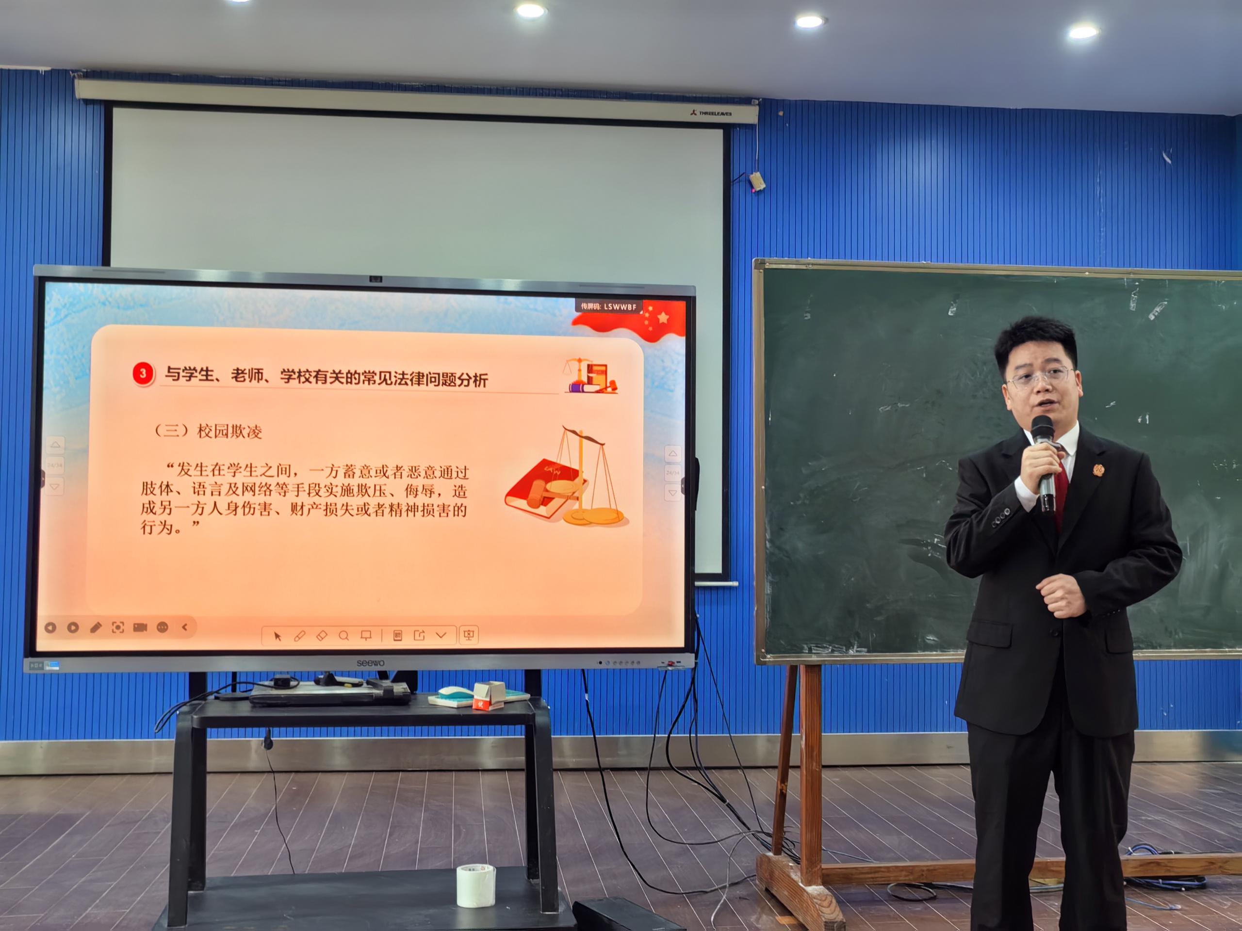 法治副校长吴璨庭长深入校园,向全体学生系统普及《中华人民共和国未成年人保护法》、《中华人民共和国预防未成年人犯罪法》等与青少年密切相关的法律法规。旨在帮助同学们明确法律底线,增强法治观念,懂得如何运用法律武器保护自身合法权益,成为一名知法、懂法、守法的合格公民。